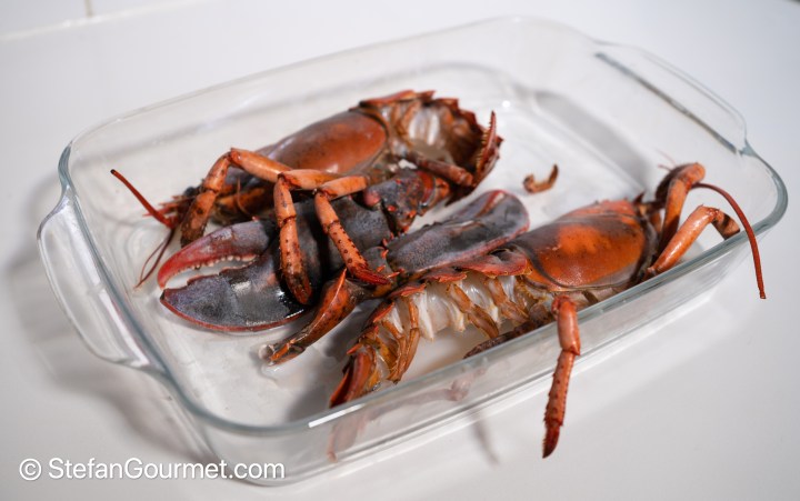 The claws need to finish cooking before you can get the meat out of them. You can either do this by returning everything but the tails to the oven for another 7 minutes, or by bringing some water to a boil, turning off the heat, and allowing the claws to steep in the hot water for 5 to 10 minutes, depending on their size. After that, allow the claws to cool in cold water. You can now (also if you are using a boiled lobster) remove the lobster meat from the claws, including the knuckles. Reserve the shells for serving the lobster.