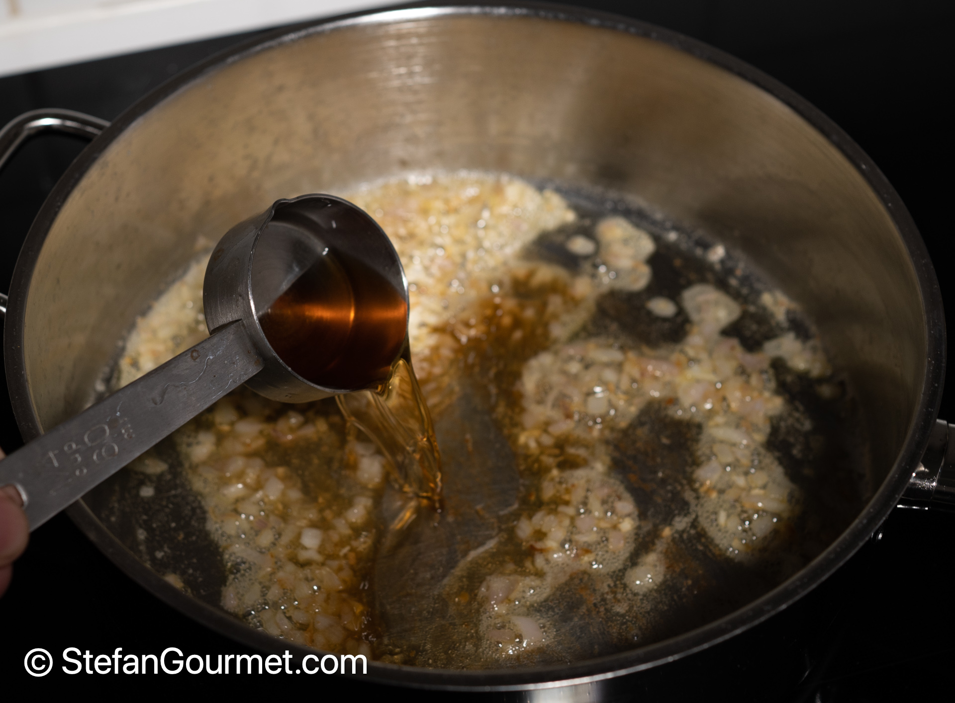 Increase the heat to medium-high and deglaze the shallots with 30 ml of cognac.