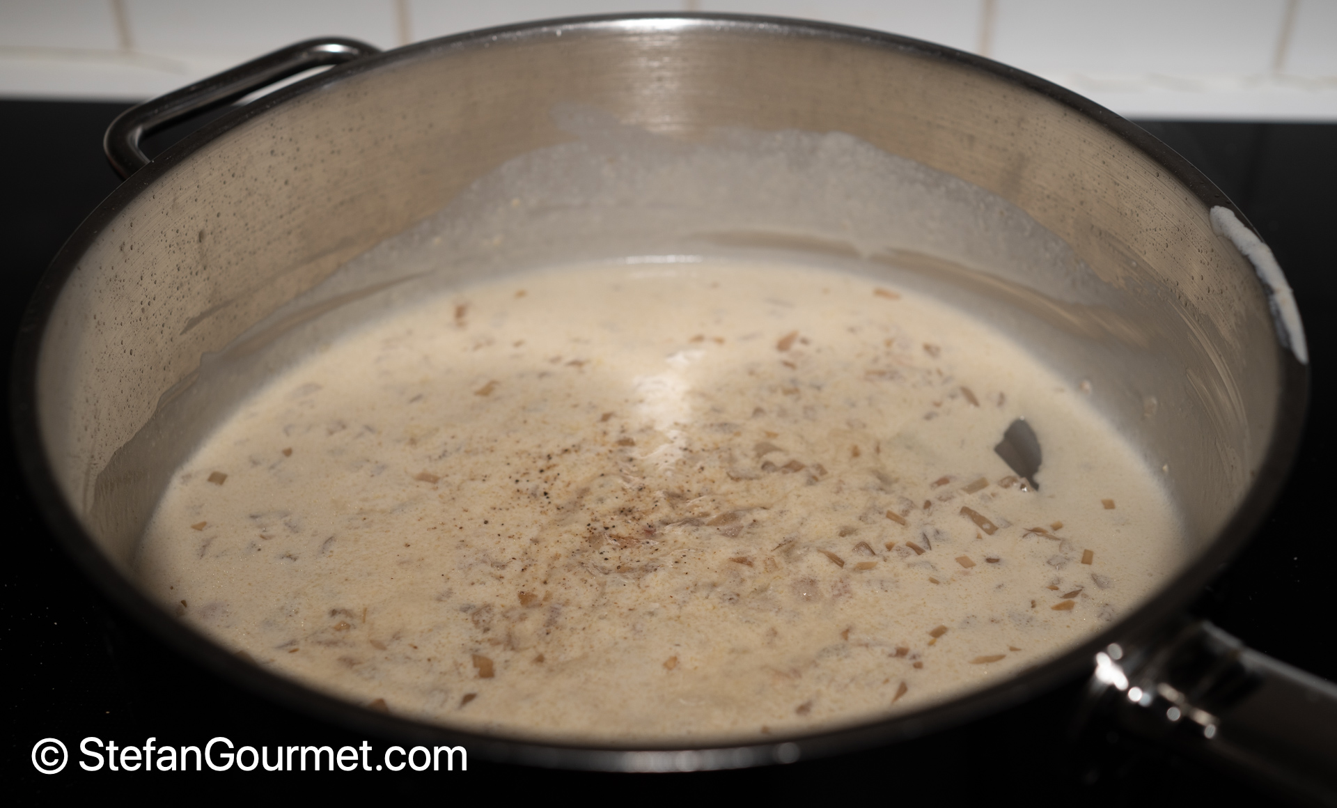 Allow the cream to reduce over medium heat, stirring regularly. When the sauce has thickened somewhat, season to taste with salt and freshly ground white pepper.