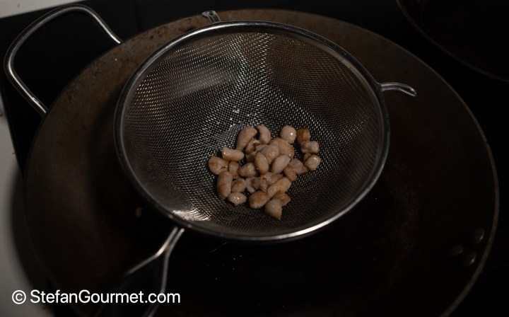 Keep going until the duck crackling is crispy and golden brown. Keep some of the rendered duck fat in the small frying pan (about 1/2 tablespoon), but put most in the large frying pan.