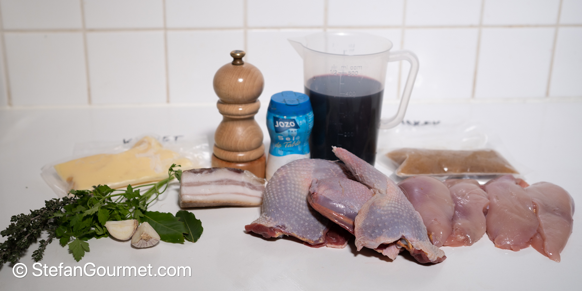 Vacuum seal the legs and breast separately, as they require different cooking times. Vacuum seal the lardons along with the legs.