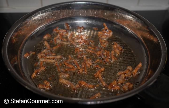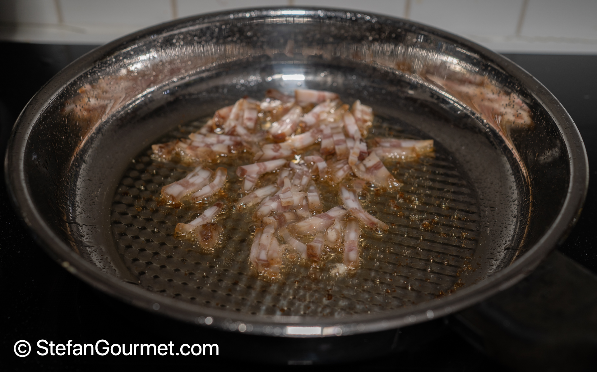 …then use a sieve to remove the pancetta, while keeping the fat in the pan. Reserve the pancetta.