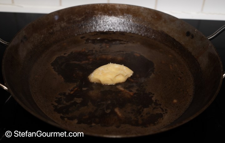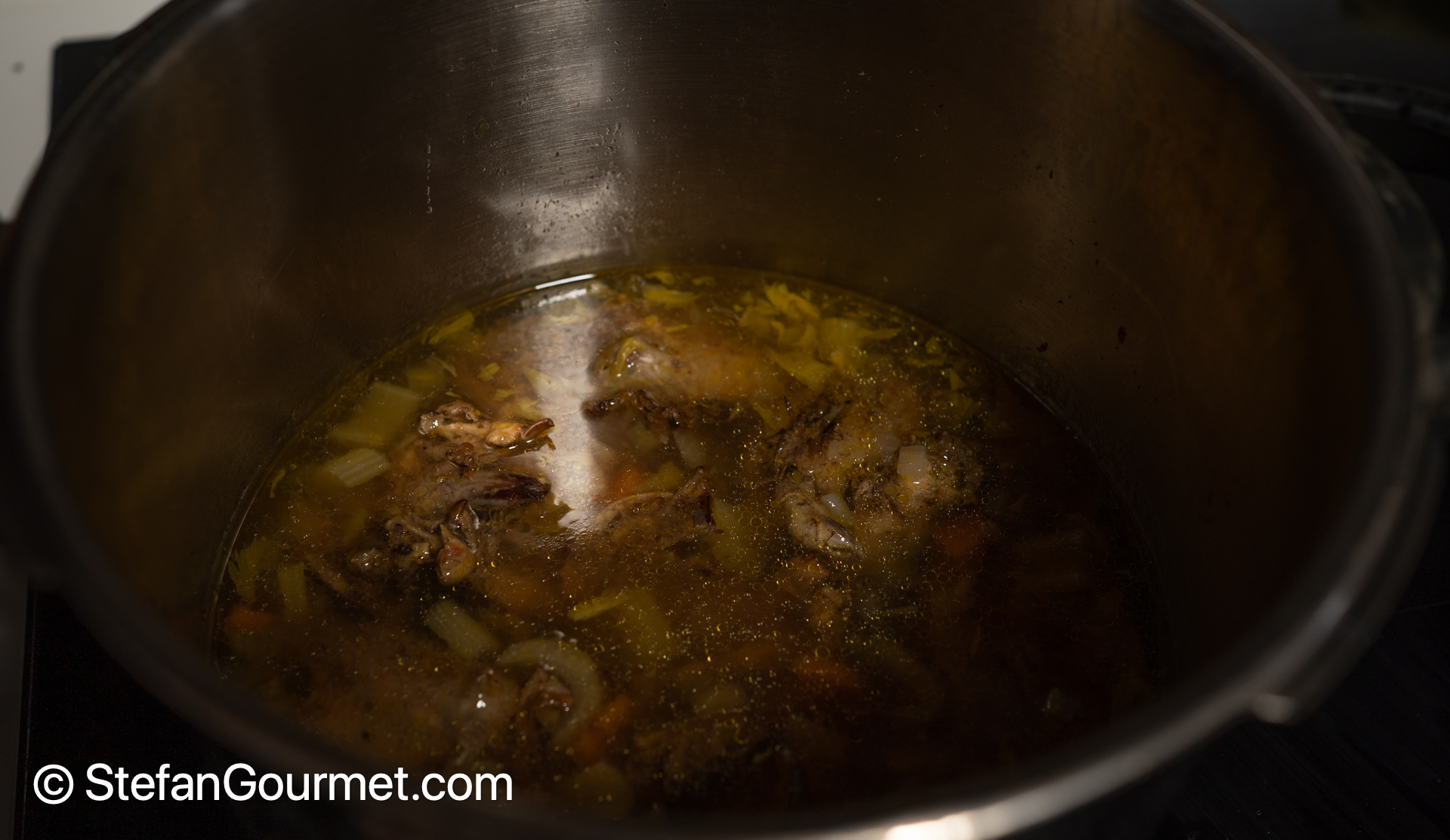 Sieve the stock and discard the solids. As you can see, these roosters were quite lean, as there is not a lot of fat floating on top of the stock. You can use that fat instead of oil for even more chicken flavor in the dish.