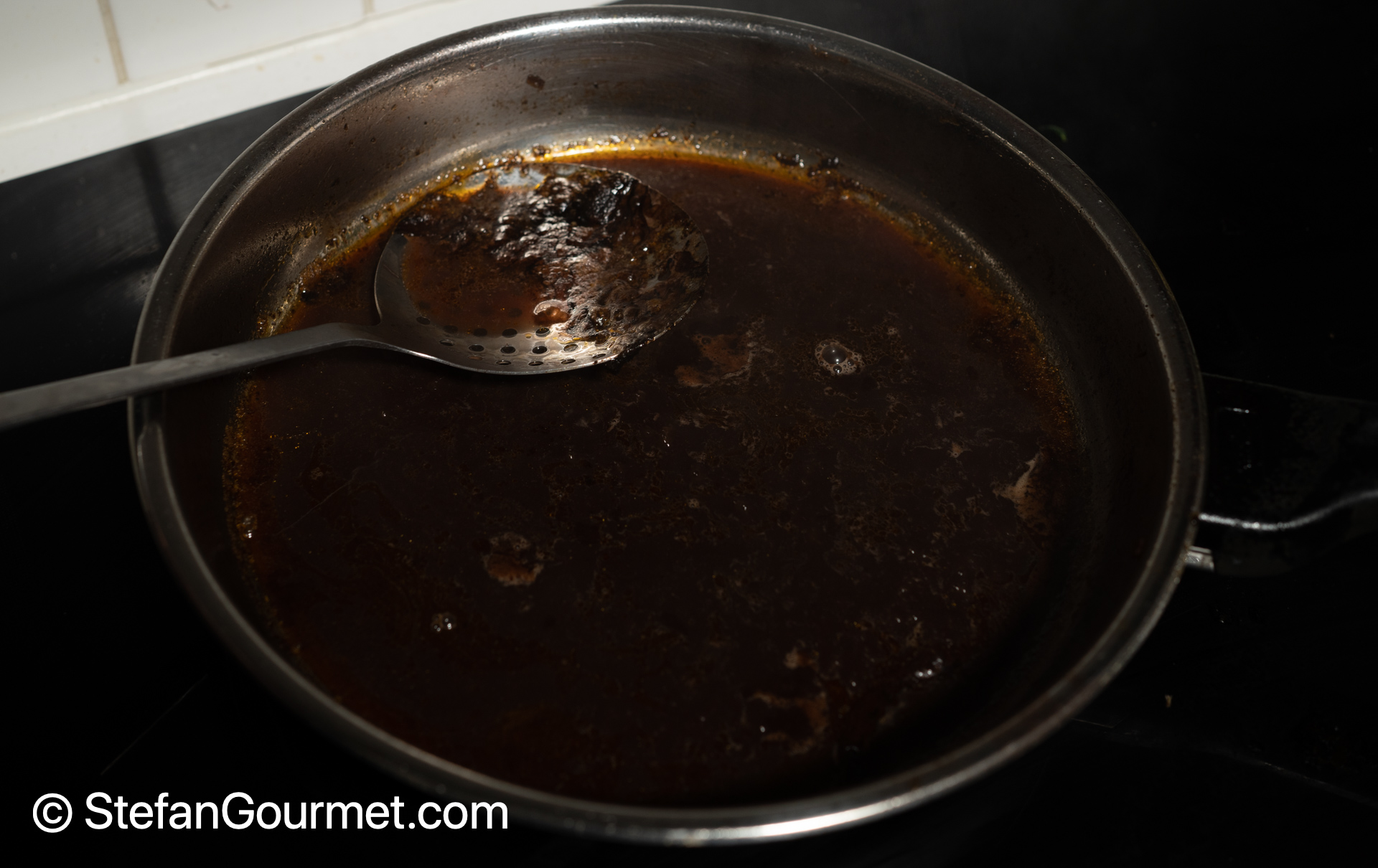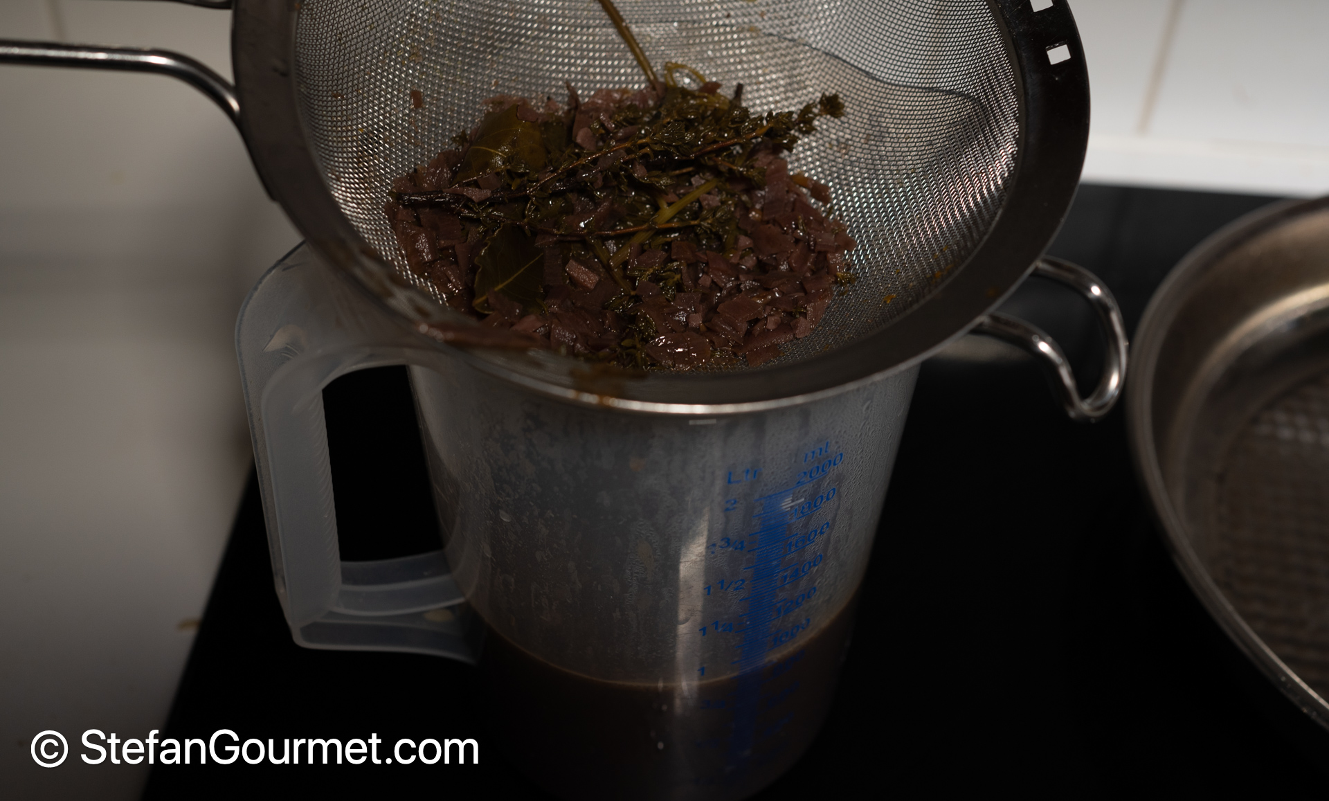 Return the sifted sauce to the pan, and simmer until reduced again by about half. Clean the surface now and then with a skimmer.