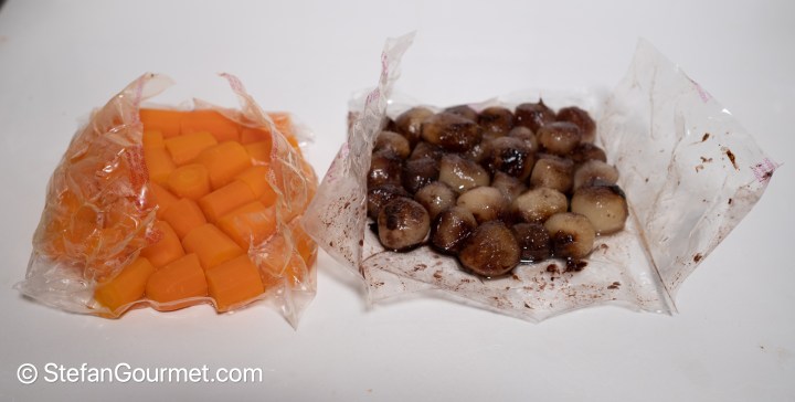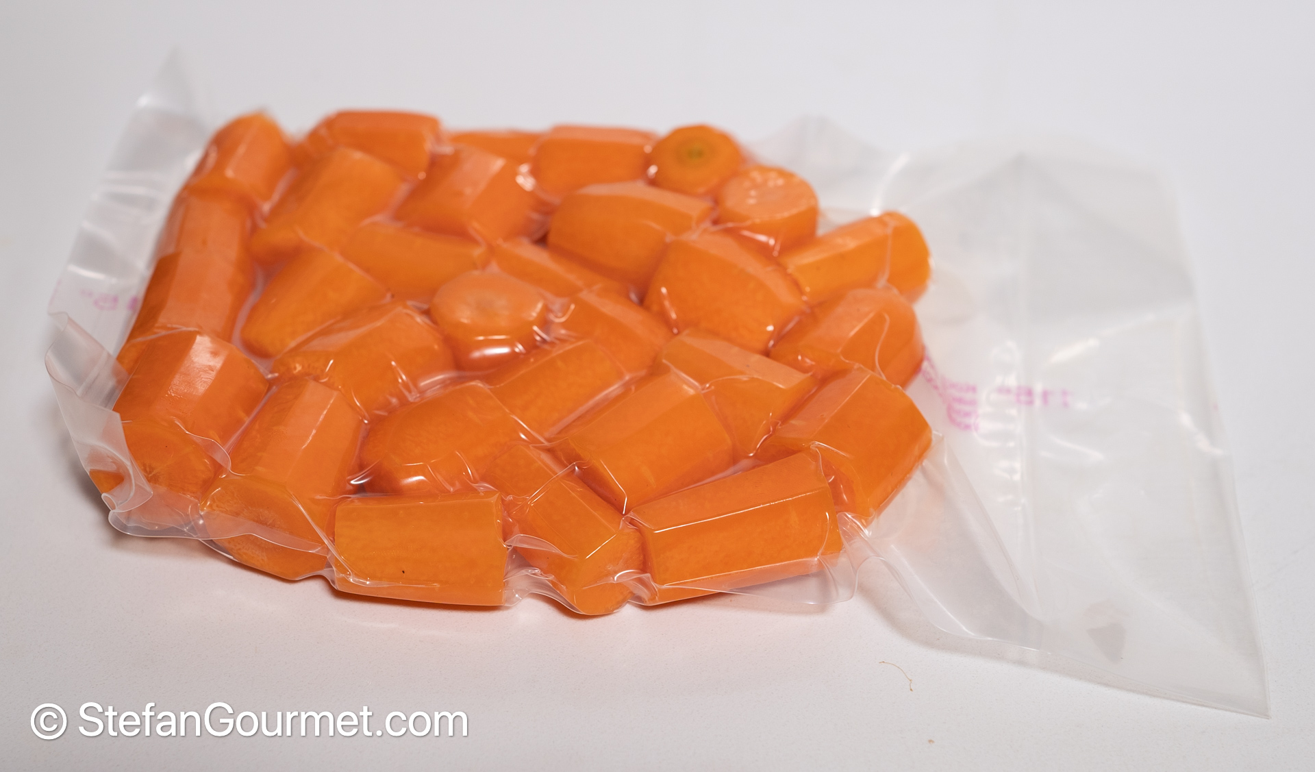 Since this is coq au vin sous vide, I thought it would be nice took the carrots and pearl onions sous vide as well. I cooked the carrots sous vide for 1.5 hours at 85C/185F with some salt.