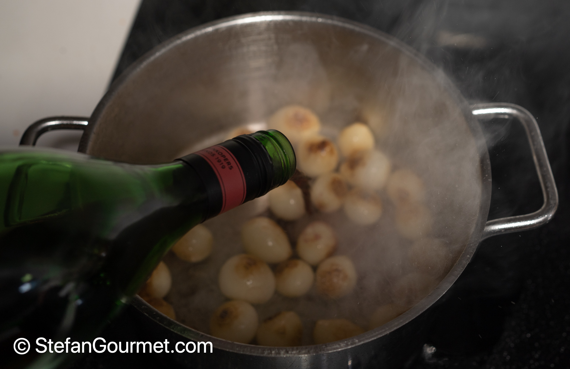 Peel the pearl onions by parboiling them for 1 minute, then chill them in cold water, and finally peel them. Heat clarified butter or olive oil in a saucepan and cook the pearl onions over medium-high heat until they are browned, turning them often.