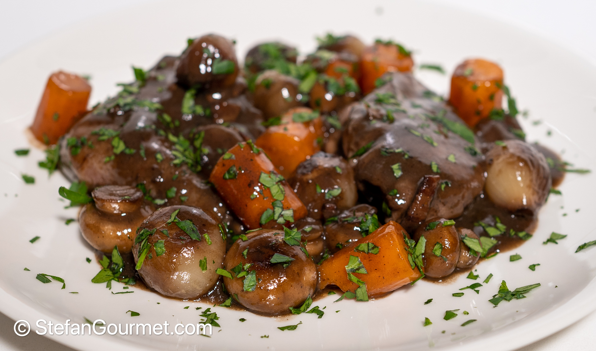Coq au vin is a famous French dish of chicken stewed in red wine. As the name implies, the recipe was originally devised to prepare a rooster. As they were usually slaughtered when they were old and tough, it took the acid of the red wine and long and slow cooking to tenderize the bird. Nowadays, coq au vin is usually prepared with chicken. The chicken we use nowadays, even if it is organic, is usually only between 6 and 12 weeks old and therefore doesn’t require the long cooking to become tender. Because it is so young and has grown so fast, the chicken has less flavor than the old rooster used traditionally.