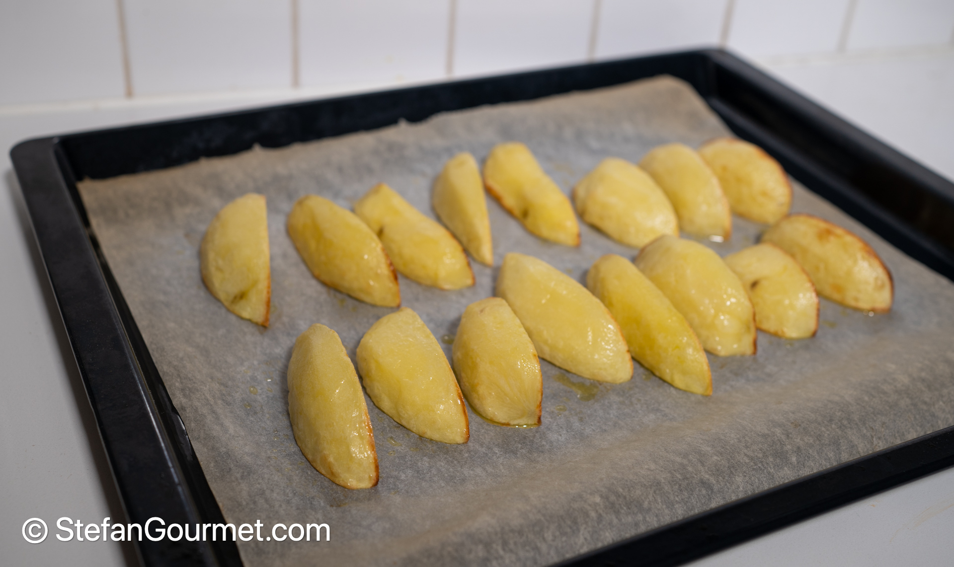 Bake the potatoes for 15 minutes at 225C/440F, then turn them.