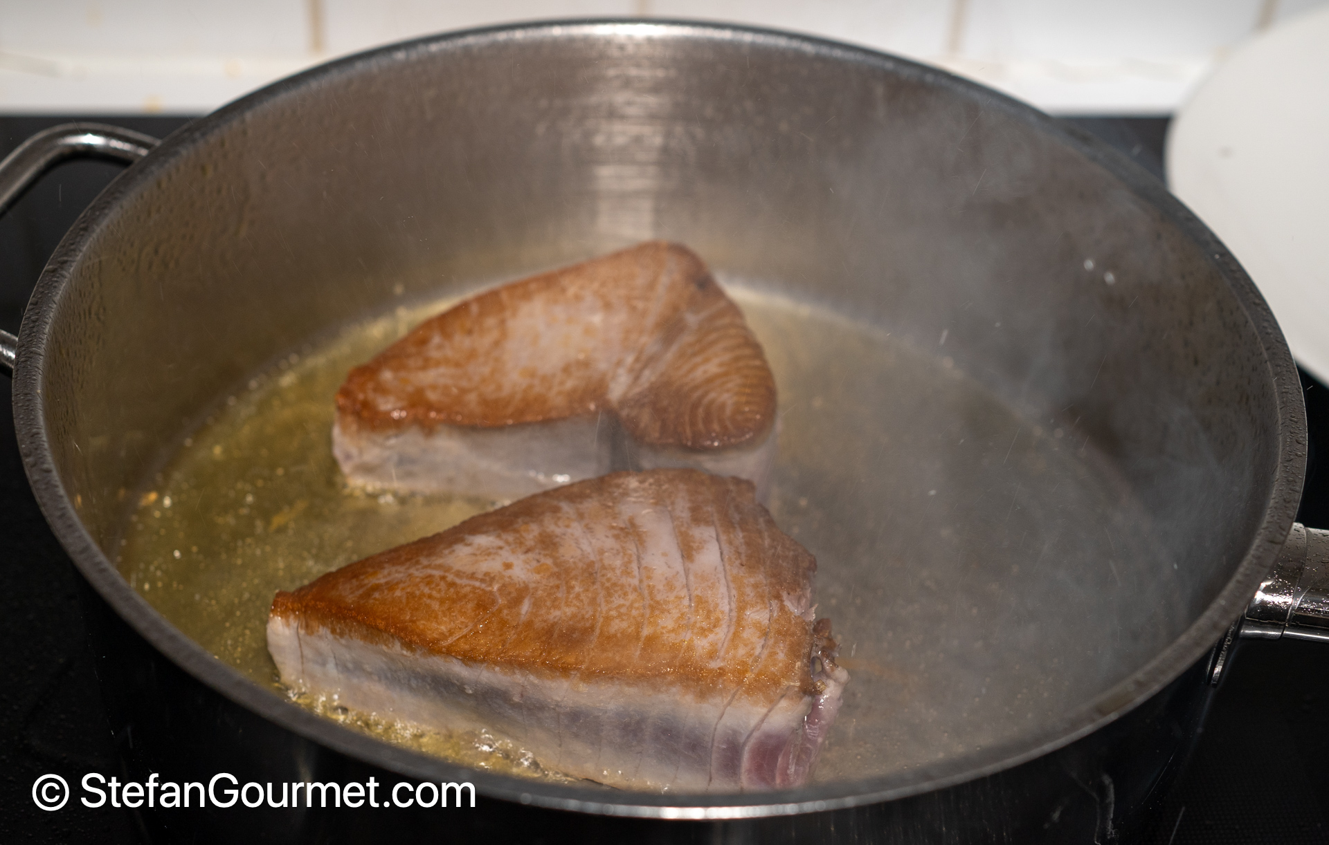 Heat 2 tablespoons of olive oil in a frying pan and sear the tuna on both sides over high heat. Take the tuna out of the pan and reserve.