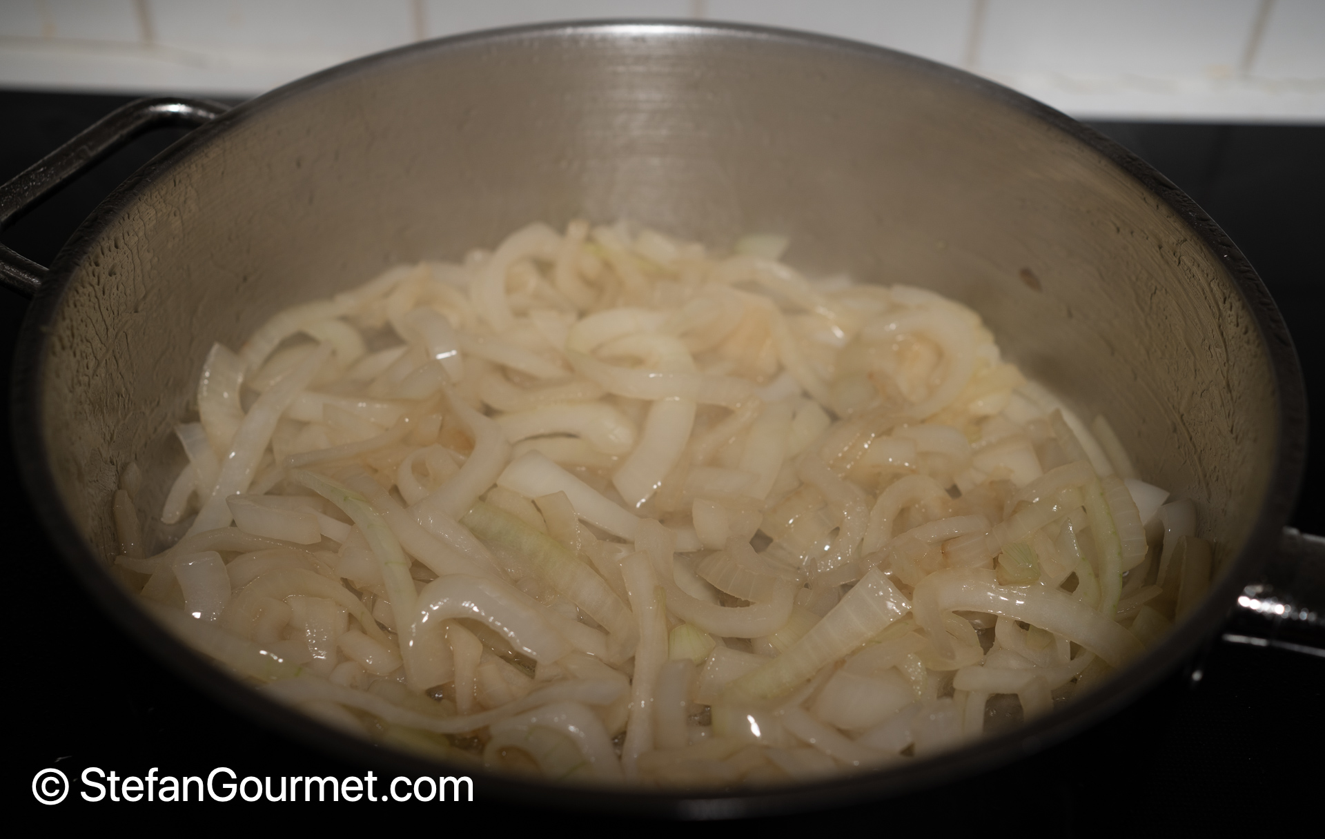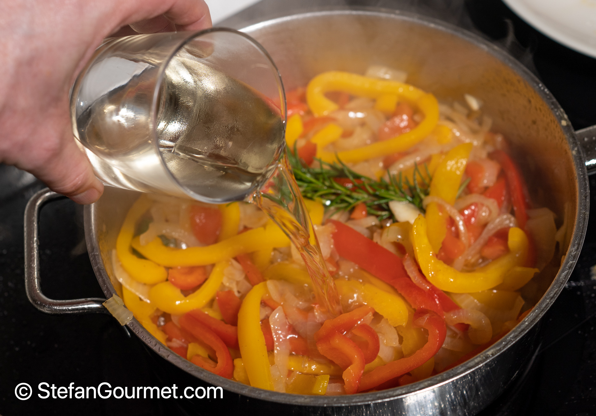 Add the white wine. Bring to a boil and cook, stirring, until the wine has been reduced by half.