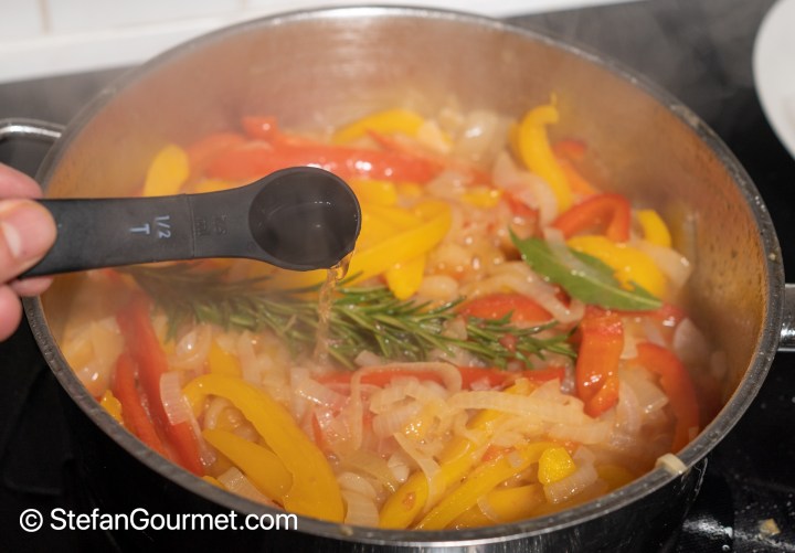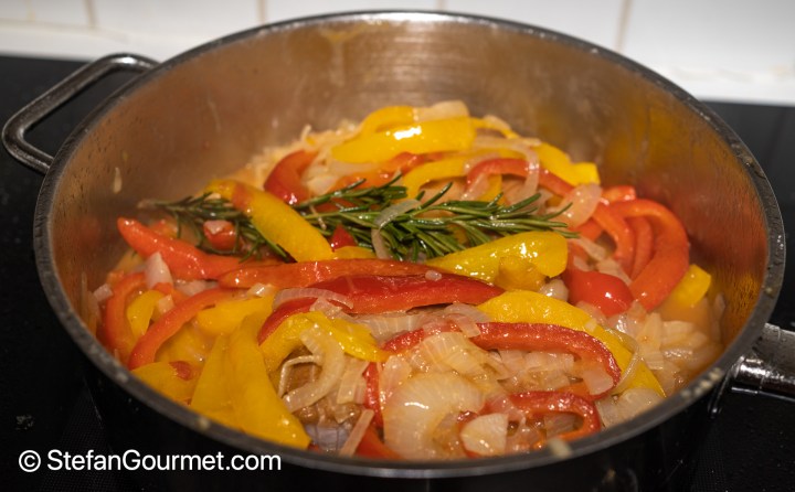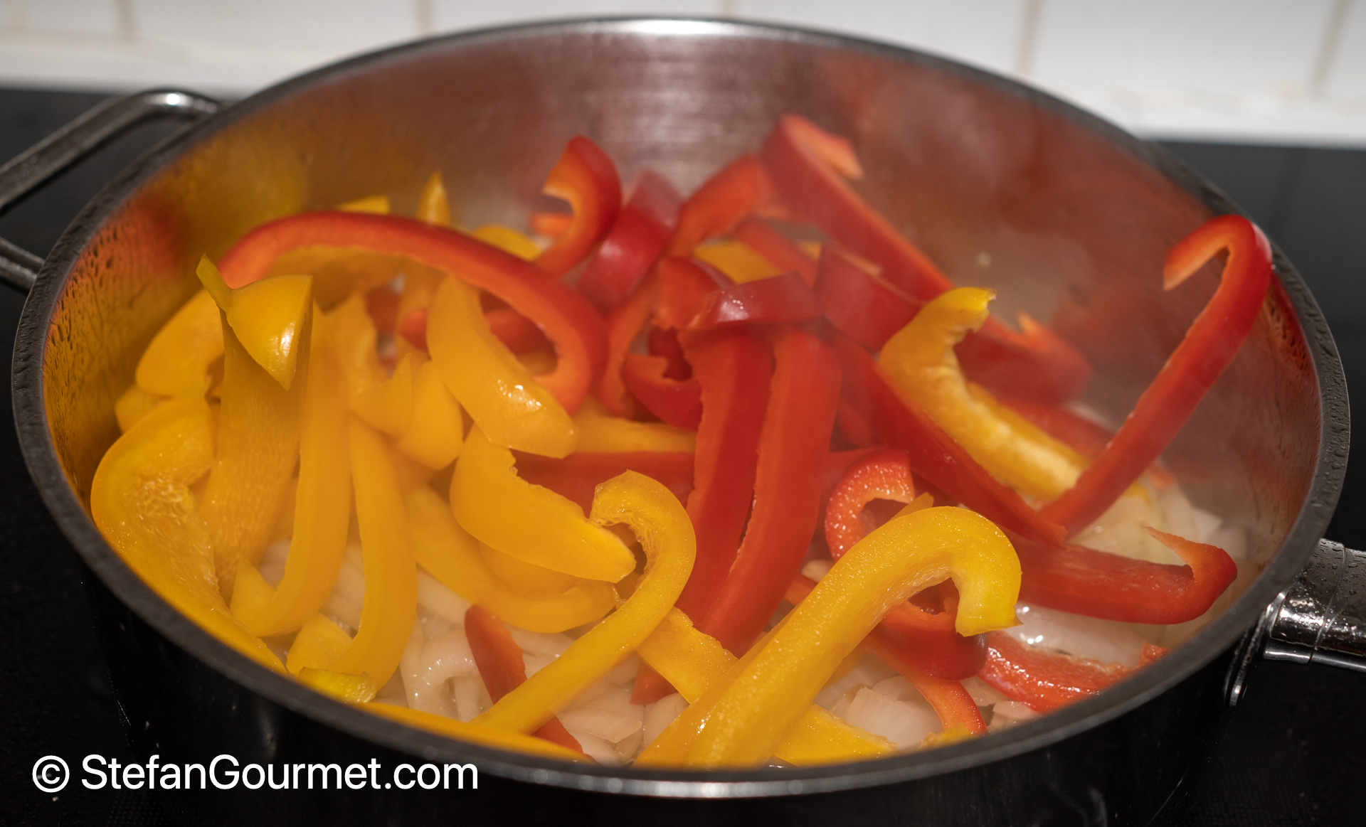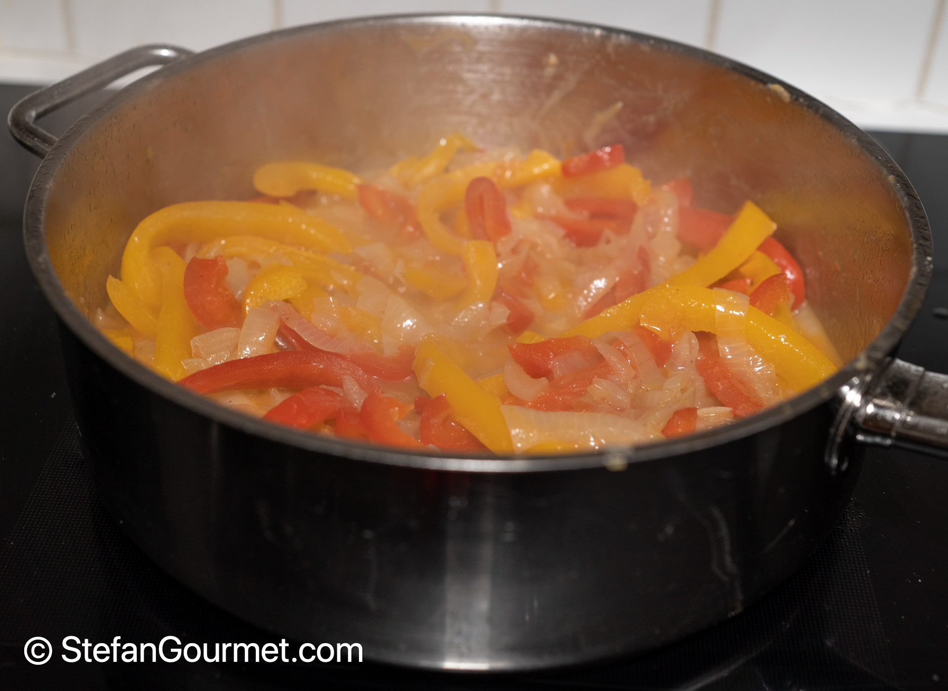 Cover and cook over medium heat, stirring regularly, until the peppers are tender but still firm to the bite.