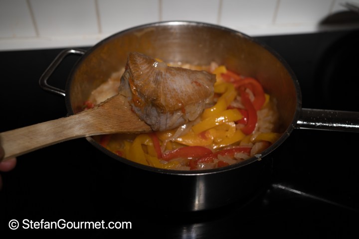 Tuna is locally caught along the Algarve in Southern Portugal, and so the local cuisine also includes recipes for tuna. Cebolada de atum is one of the most common dishes. The name “cebolada” refers to the onions in the dish and there are many variations of this recipe. I tried the dish at restaurant Ponto de Encontro in Tavira and their version included bell pepper and the tuna was braised. Braised tuna doesn’t sound as good as it actually was, as it was tender and juicy. This was probably due to the quality of the tuna; I suspect it was from the belly and therefore fatty enough. You could also just sear the tuna and keep it rare inside, and still serve it with the braised onions and bell peppers.