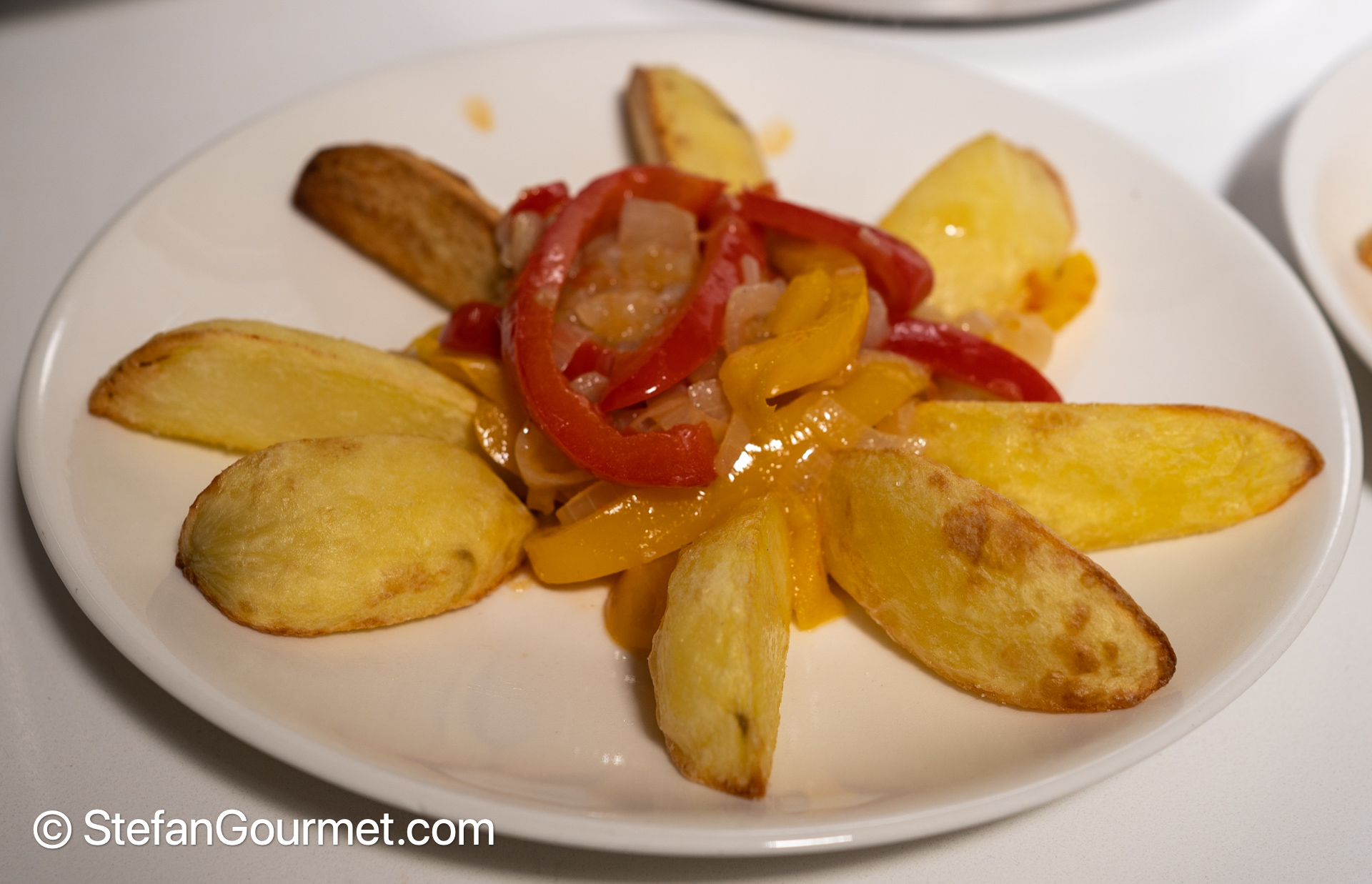 Arrange the potatoes and half of the peppers and onions on preheated plates.