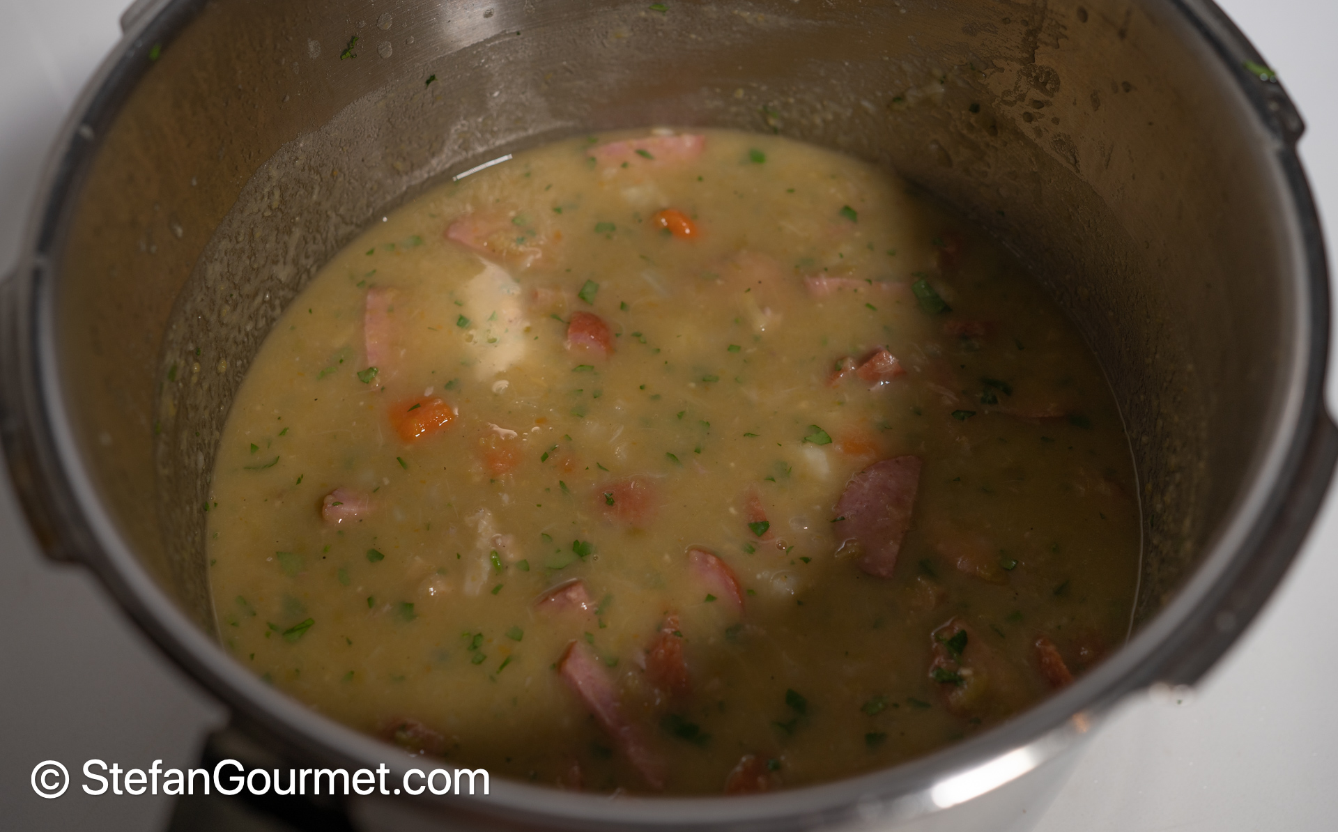 Someone in our Dutch sous vide group on Facebook asked if anyone had ever tried to make erwtensoep (Dutch pea soup) sous vide. I had not, and my first thought was that it didn’t make any sense, because the peas are supposed to be cooked until they fall apart. But then I thought there could be merit in cooking the pork sous vide. Now I don’t believe that sous vide is the answer to everything, but I also believe that you should always try before passing the verdict. And so I went ahead and prepared sous vide erwtensoep, or more precisely erwtensoep with sous vide pork. For the classic preparation without sous vide, click here. In that post I used pork belly, but it is even more traditional with ham hock (pork shank).