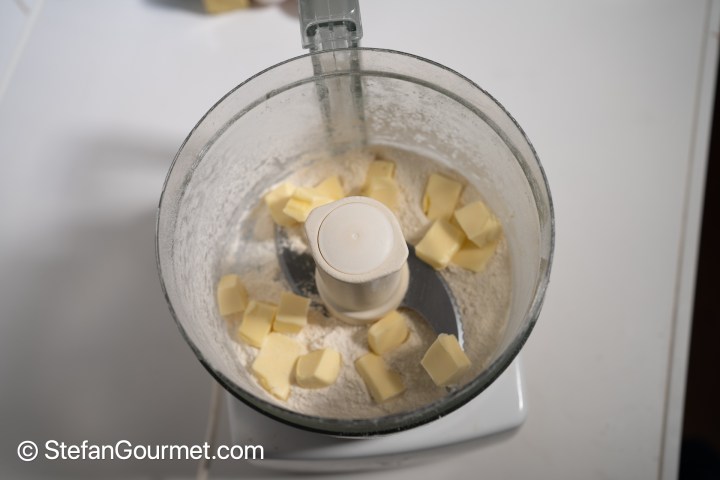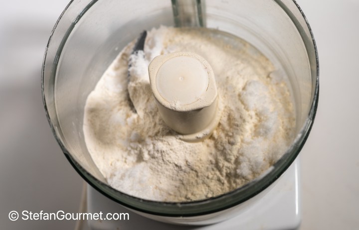 Combine 85 grams of the pastry flour with 25 grams sugar and 1/4 teaspoon salt in the bowl of the food processor, and process until mixed.