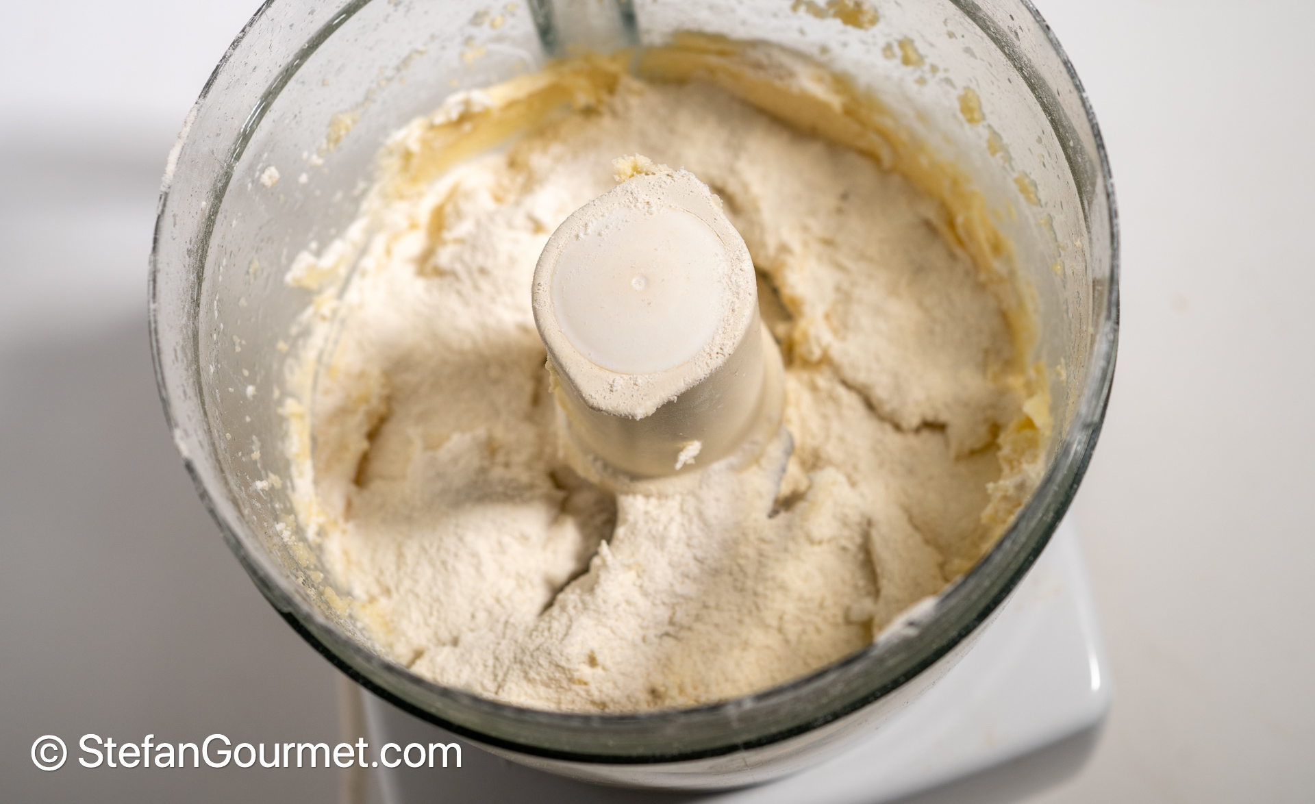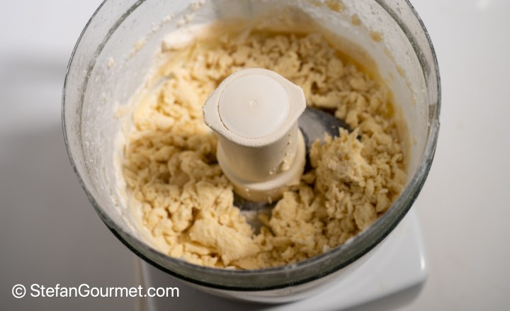 Pulse a few times, until you get small clumps of dough that are covered with flour.