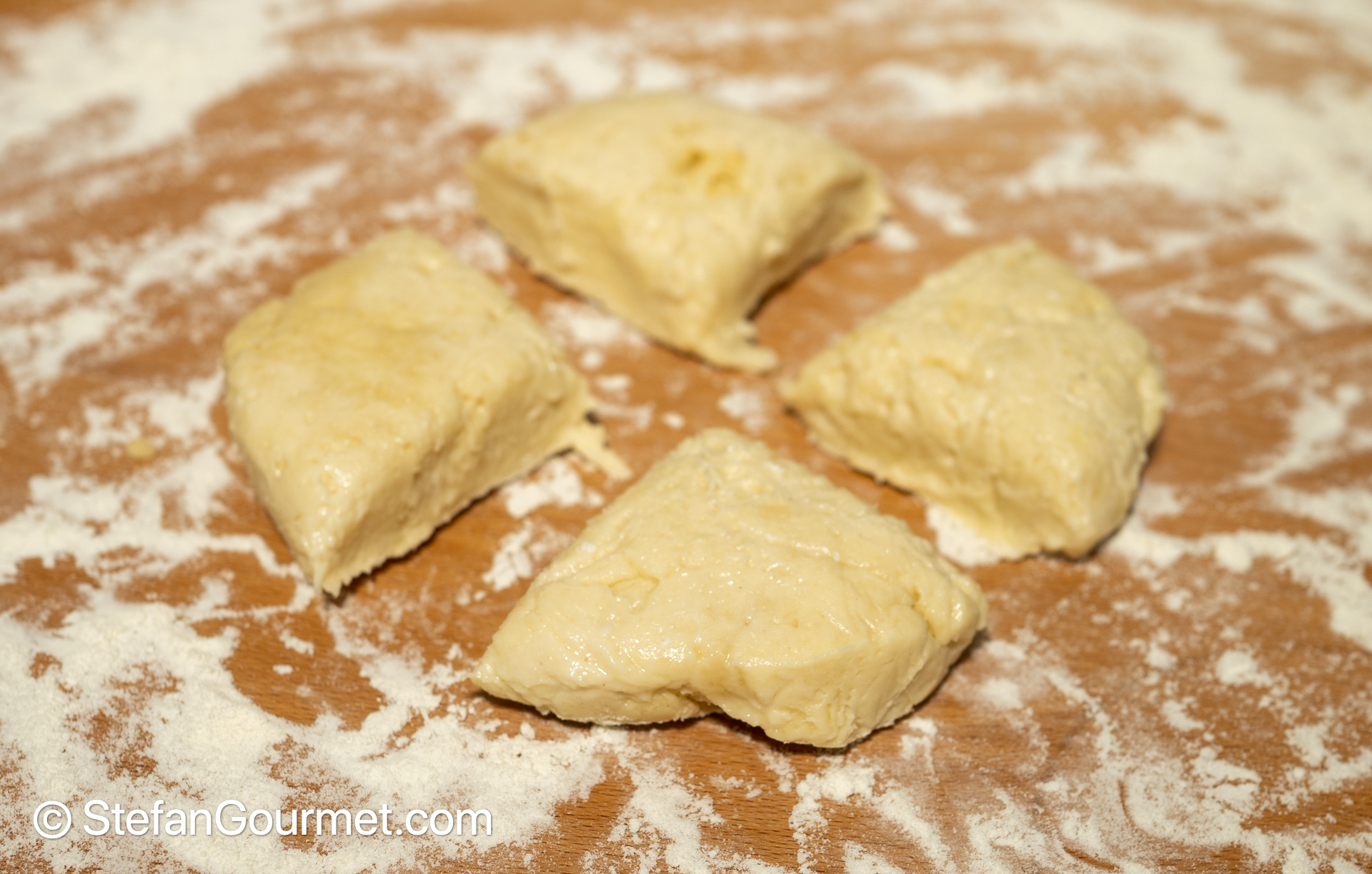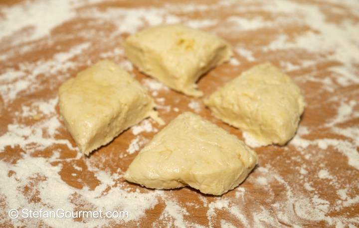 After the dough has rested in the refrigerator, take it out and divide it into 4 equal parts.