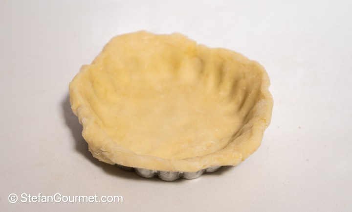 Place the circle of pastry in the buttered shape, and push with your fingers to line the shape smoothly with the pastry.