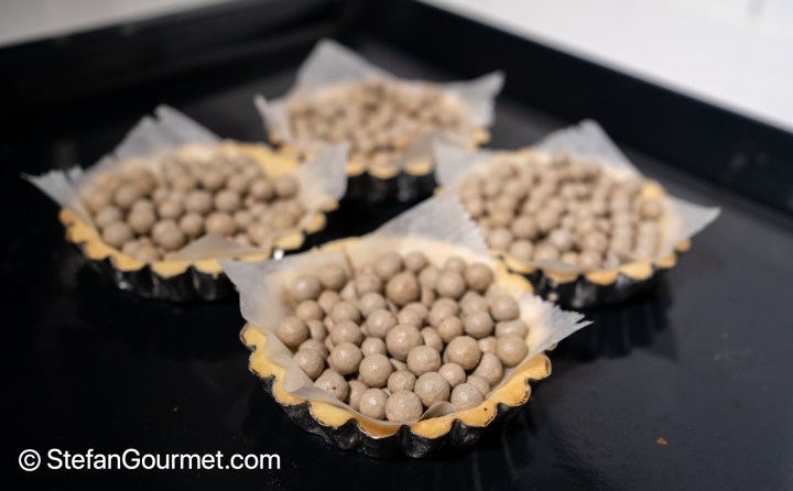 Line each tartlet with oven paper and pie weights.