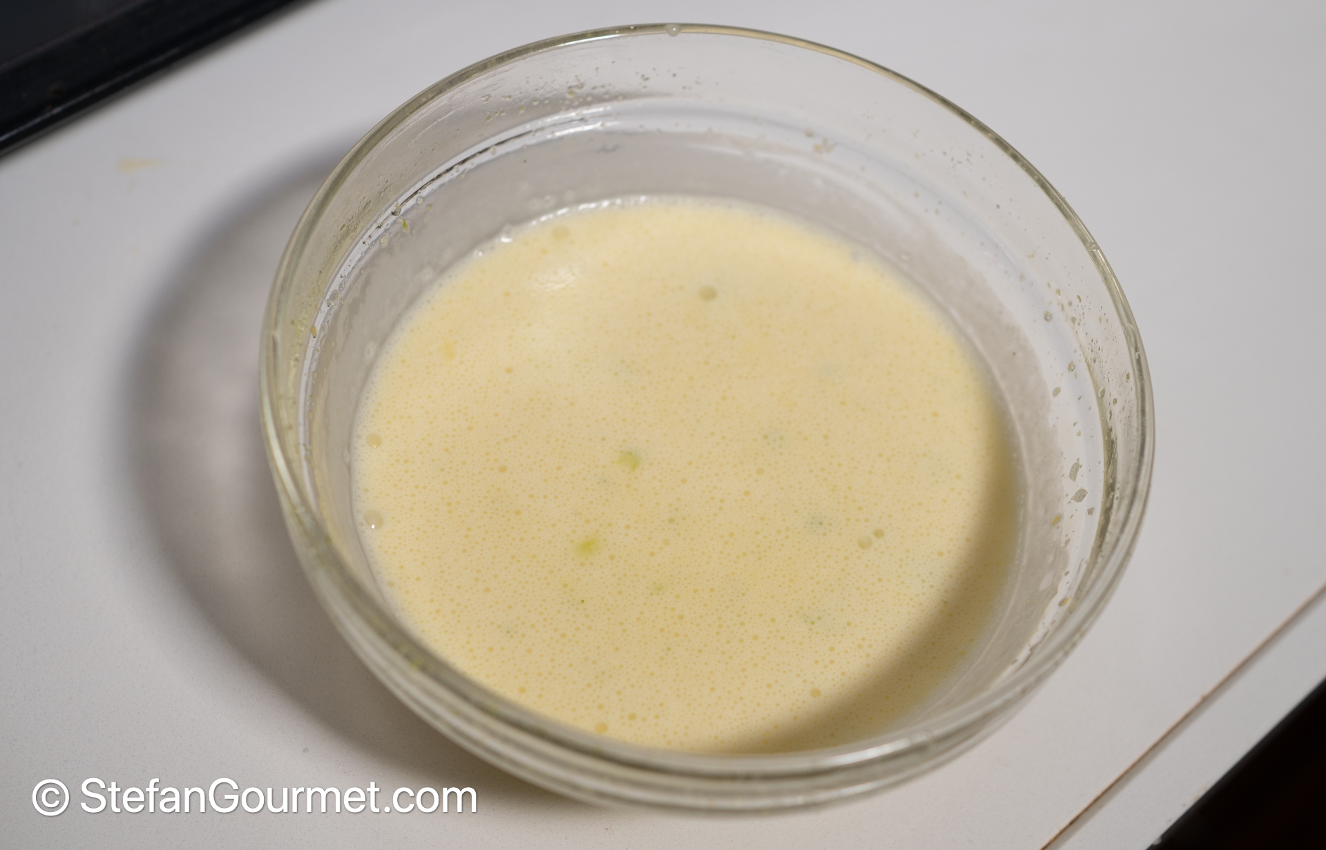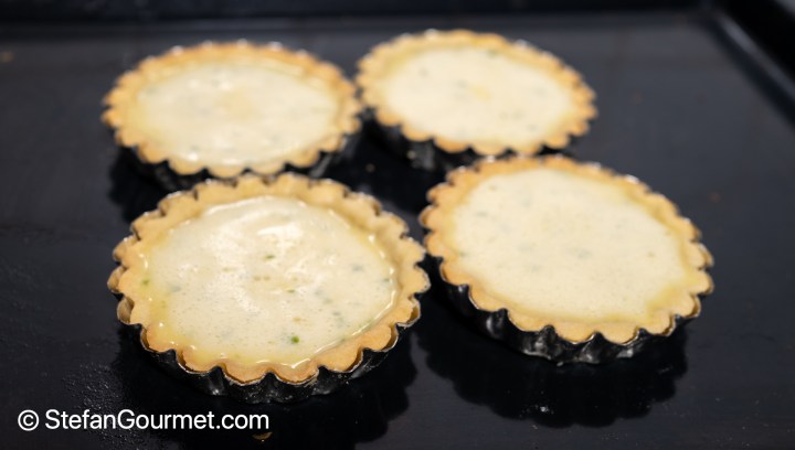 Instead of making one large pie I made individual tartlets, as that is nicer for serving. Because the tartlet shapes I own are only 2 cm (3/4 inch) high, there is relatively less custard than in a Key Lime Pie. If you prefer more custard, use shapes that are 4 cm (1 1/2 inch) high, and double the amount of custard.