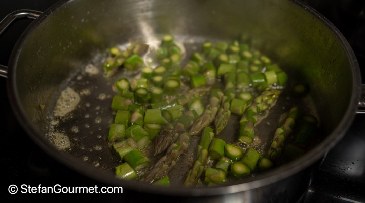 Melt 25 grams of the butter in a frying pan over medium-high heat and add the asparagus.