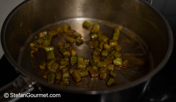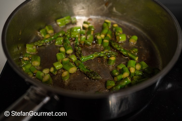 Sauté the asparagus over medium-high heat until they are starting to brown a little.