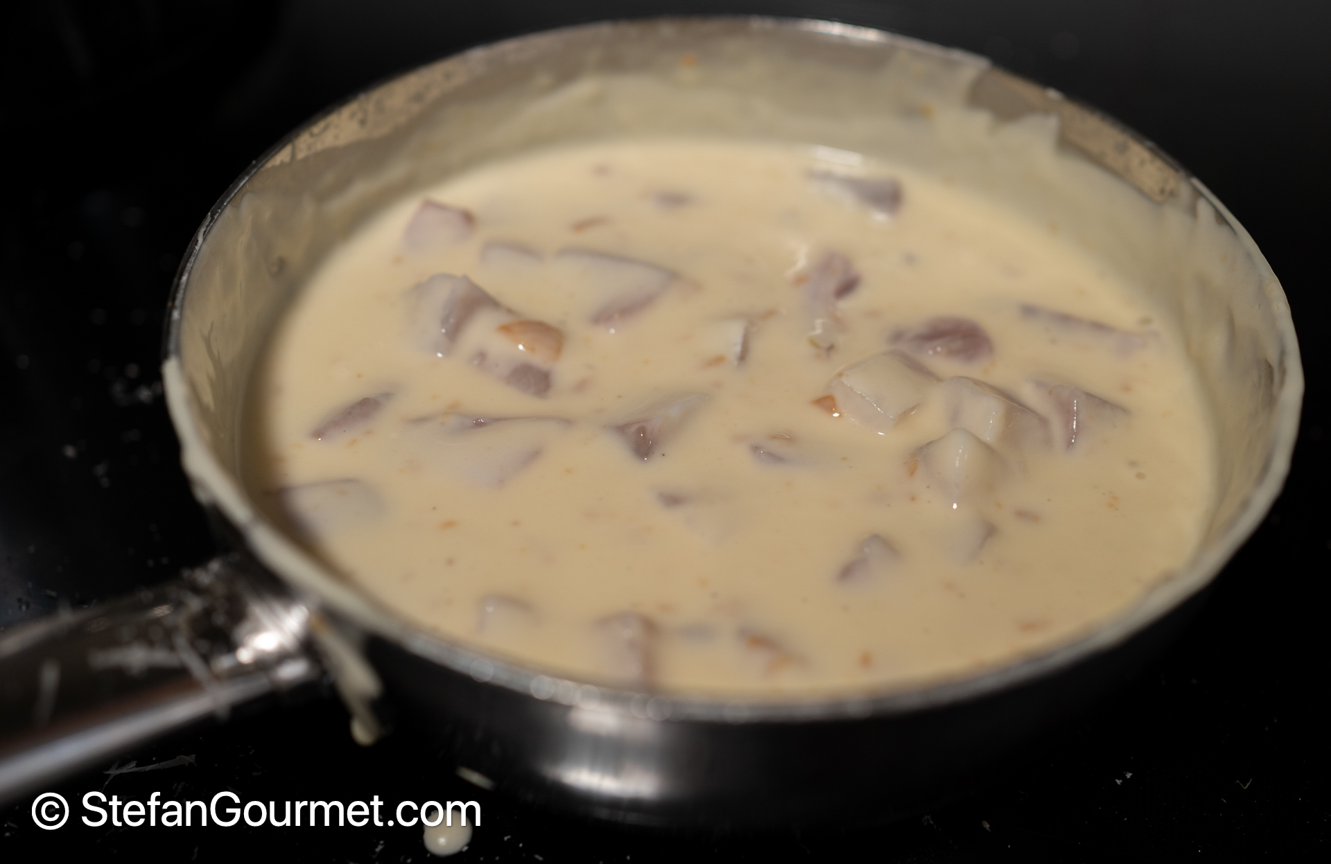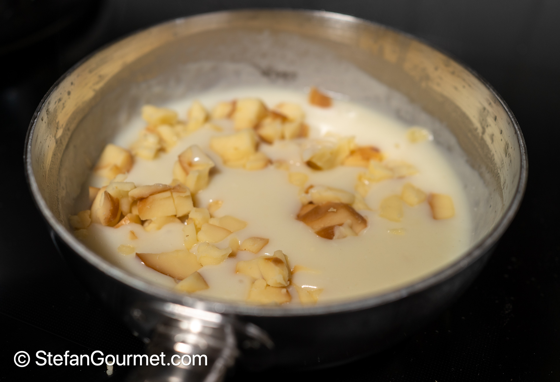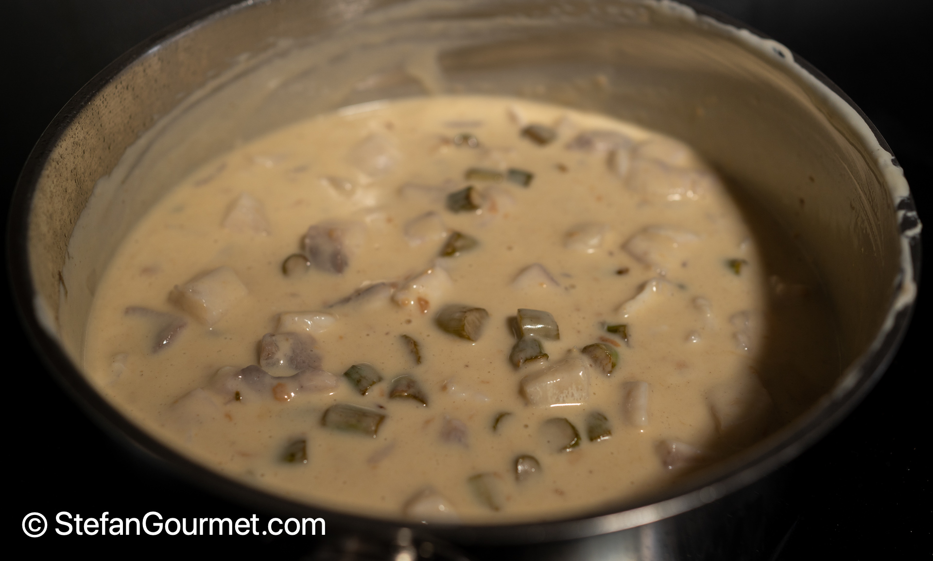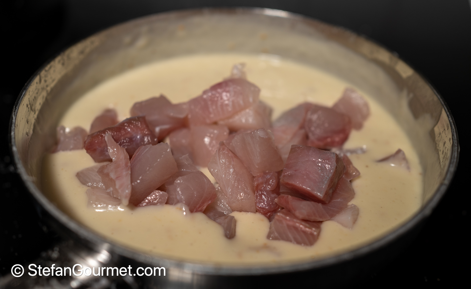 Add the diced fish to the cheese sauce.
