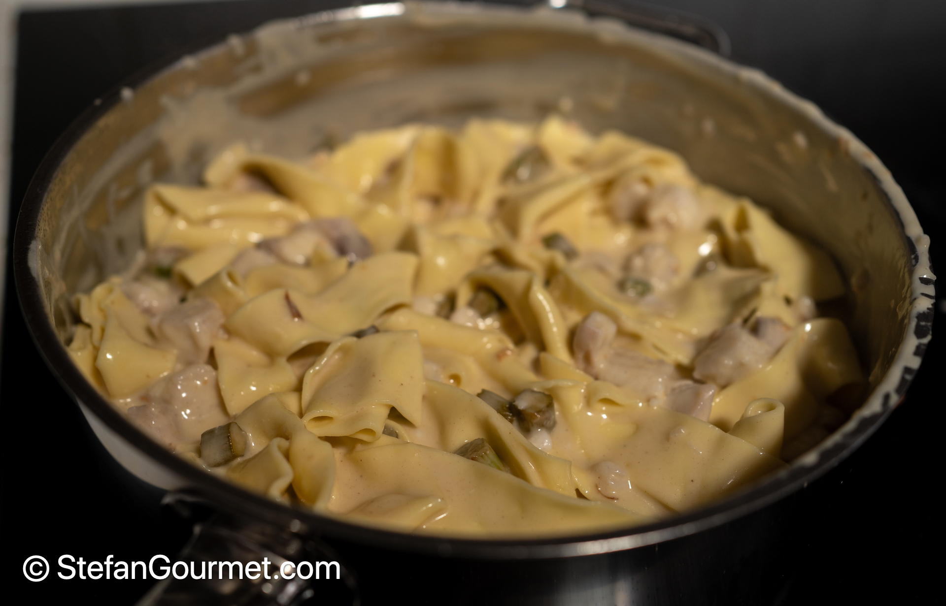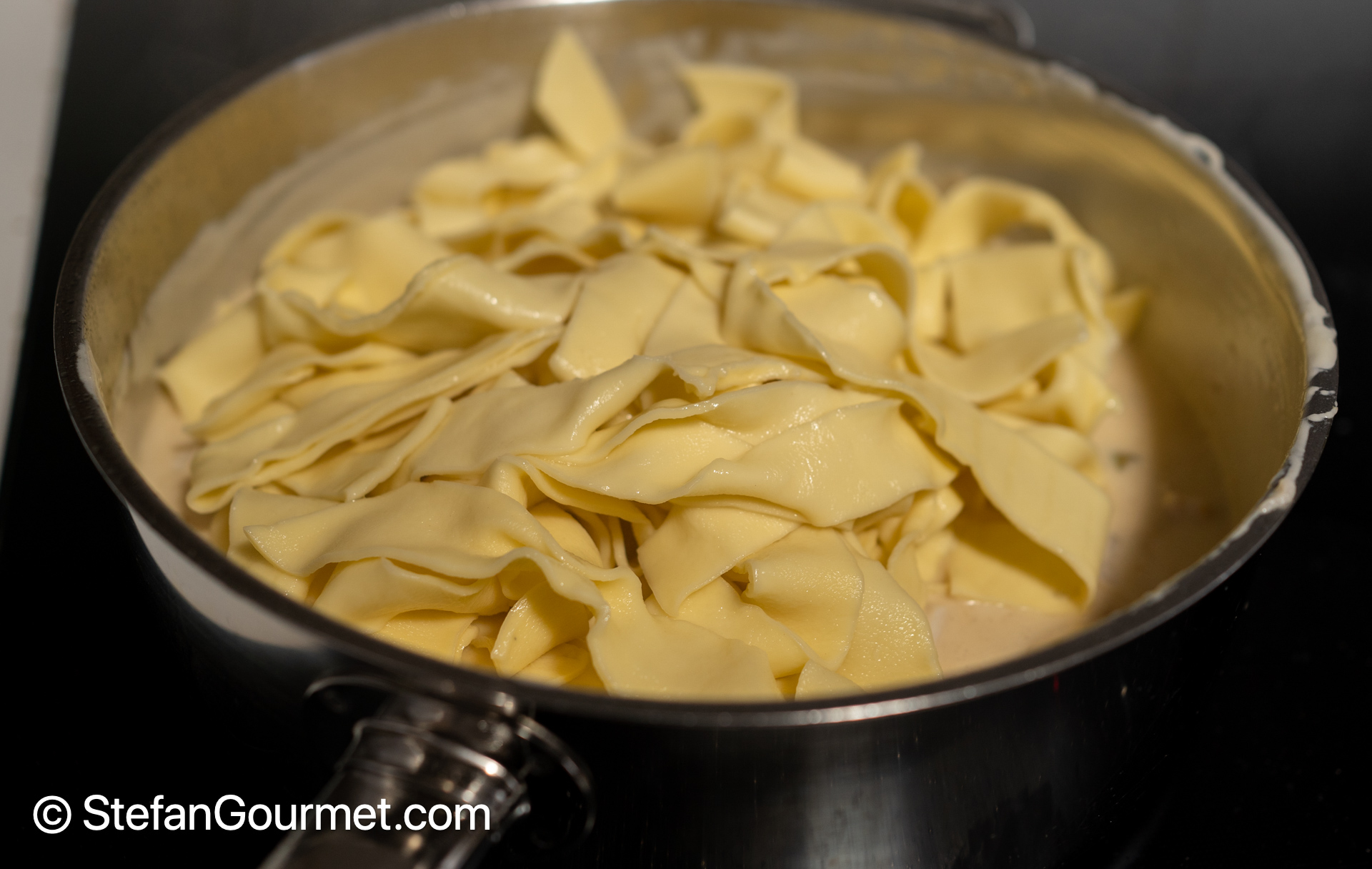 In the meantime, cook the pappardelle. The cooking time will depend on their thickness.