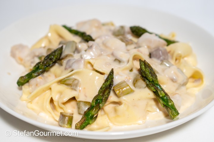 Then I thought of the secondo piatto shown above that I’ve already made several times and is very good. It can also be made with green asparagus instead of zucchini, but I decided that I wanted to make a primo piatto instead. I also had some eggs in my fridge, and although they didn’t need to be used up, I decided to make fresh pappardelle. They were dressed with a smoked cheese sauce, in which I gently poached the fish. I sautéed the asparagus in butter and served everything together. Although I suppose pasta svuotafrigo is usually not as elaborate or fancy as this, it turned out excellent, and next time I will buy the ingredients on purpose to make this again. Fish and cheese are not often combined in Italian cooking (and is sometimes even referred to as heresy), but in this case it works very well, as the kingfish has enough flavor to stand up to the cheese sauce. And I did get the inspiration for the combination of this fish with a scamorza sauce from a Michelin starred restaurant near Naples.
