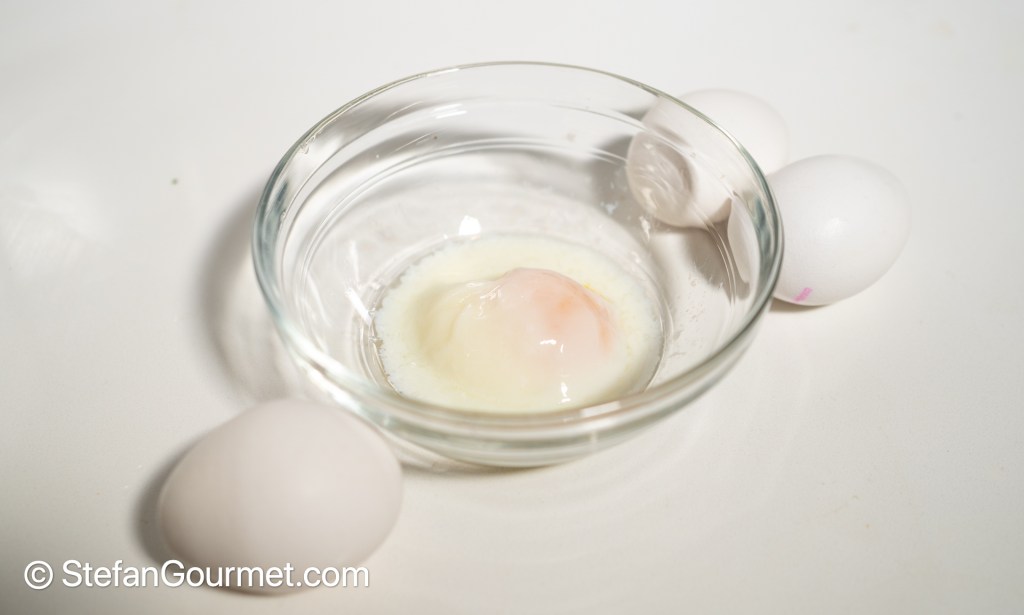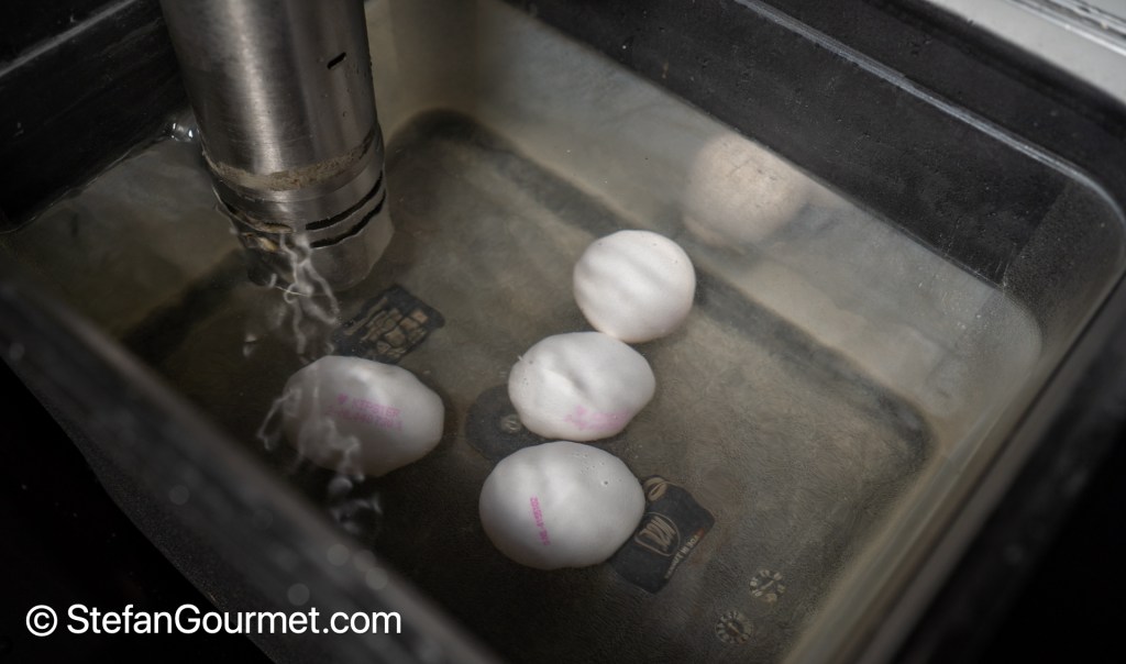 When cooking eggs sous vide at 64C/147F, the yolk will become semisolid (like a custard), but the egg whites will remain soft. Break the eggs into a bowl…