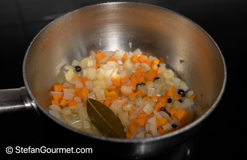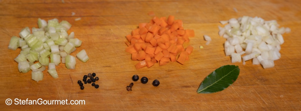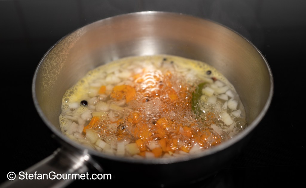Put 30 grams (1/4 cup) diced carrot, 30 grams (1/4 cup) diced celery, 30 grams (1/4 cup) diced onion, 60 ml (1/4 cup) dry white wine, 3 juniper berries, 1/2 tsp black peppercorns, 1 clove, 1 bay leaf and 15 ml (1 Tbsp) white wine vinegar in a saucepan, together with 250 ml (1 cup of water), and bring to a boil.