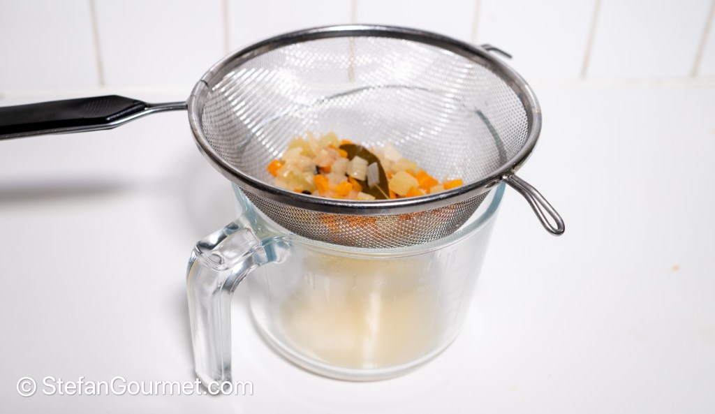 Strain the liquid through a sieve, pressing down on the solids with a spoon to get as much liquid and flavor out as possible.