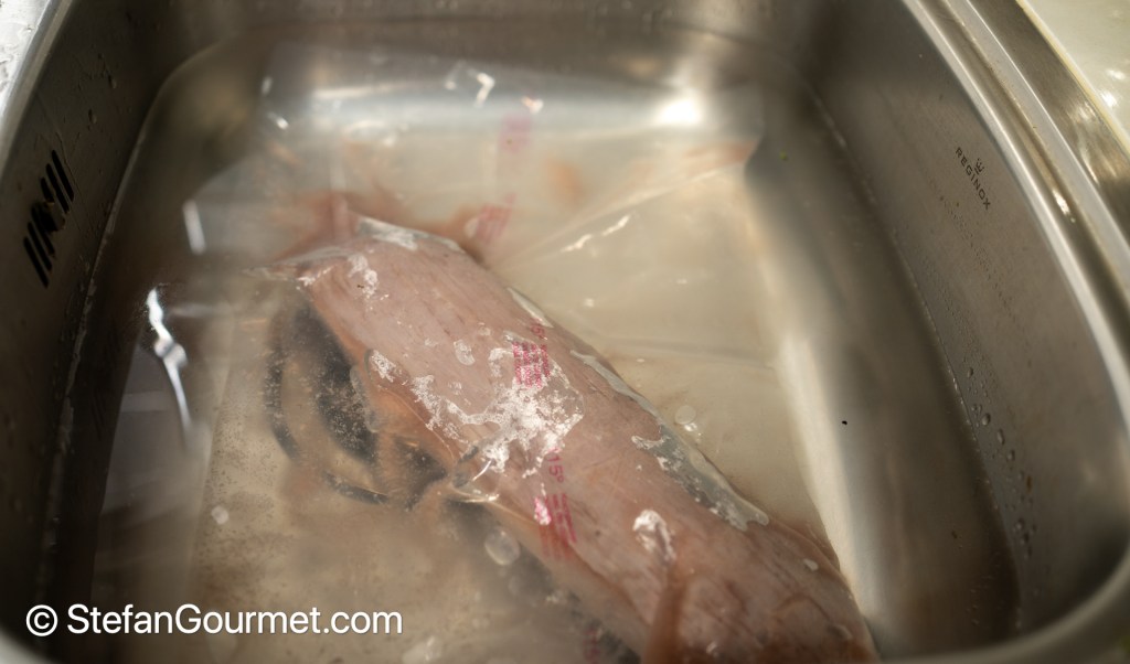 Chill the veal in cold water with ice cubes, while it is still in the plastic bag. Chilling the veal completely will take about the same time as heating it through, i.e. 2 hours and 50 minutes. Replace the ice as it melts. Chilling in water with ice cubes happens a lot quicker than in the refrigerator.