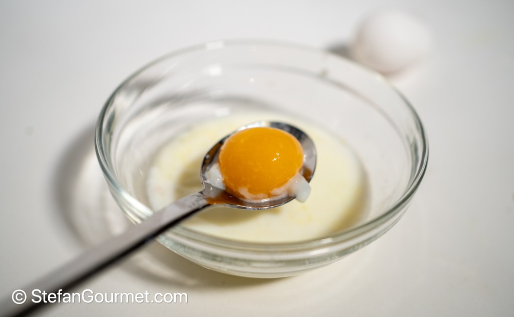 …and take out the egg yolks with a spoon. The egg whites can be saved for another use (such as making a Siberian omelette). (Please note that although the egg whites are still soft, they are completely pasteurized.)