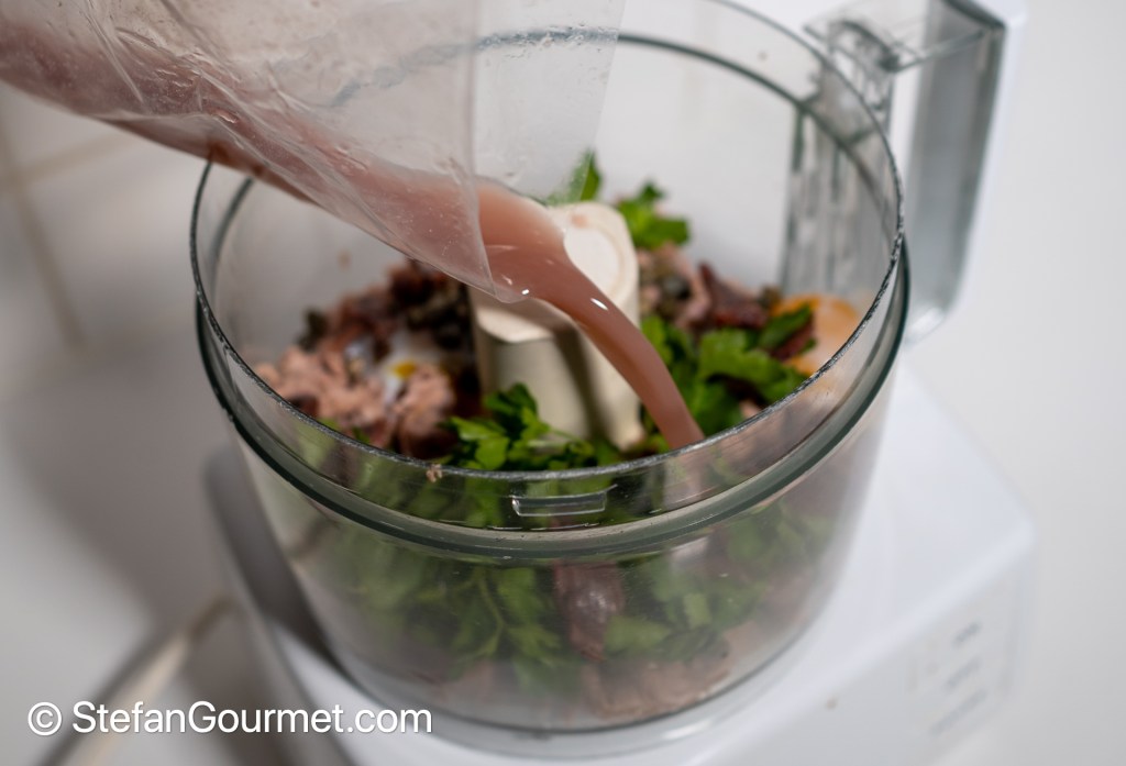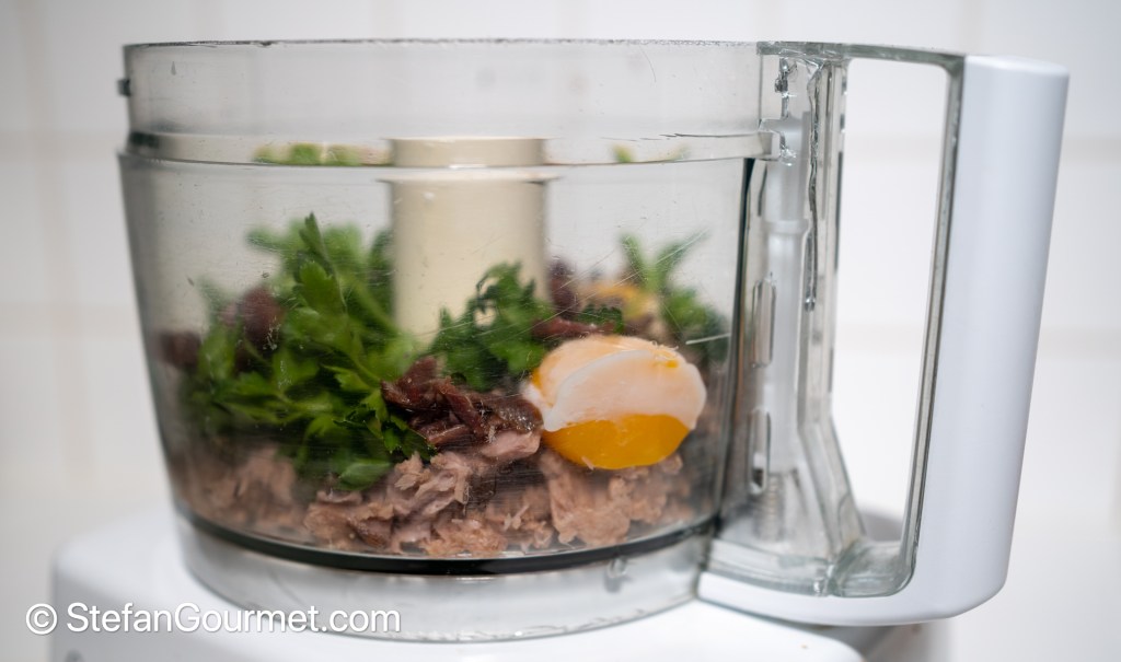 Put the tuna, capers, anchovy fillets, parsley, and egg yolks in the bowl of a food processor.