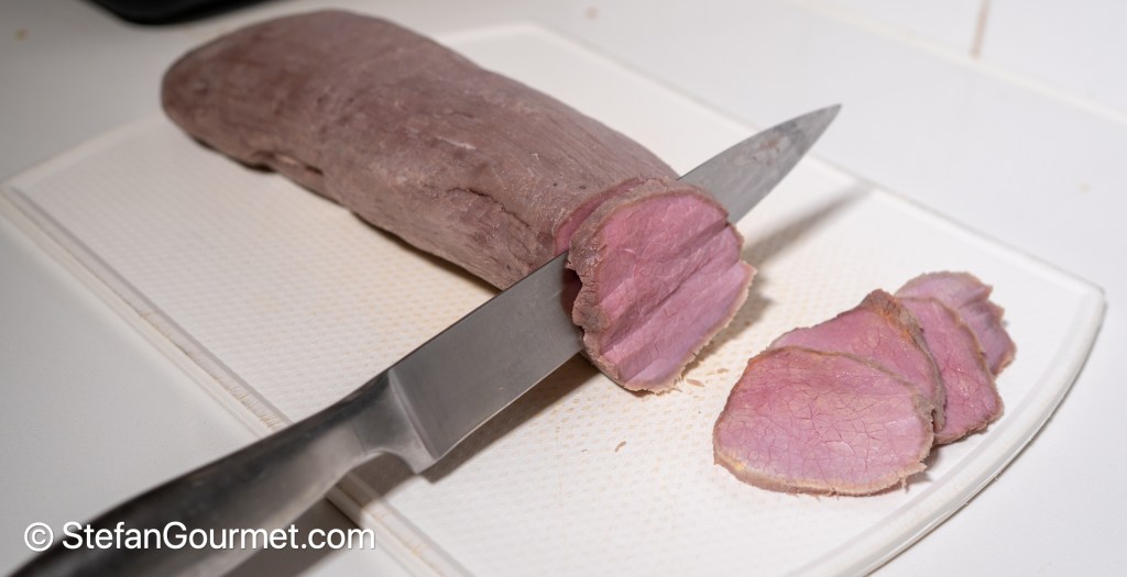 According to the table in this article, the minimum cooking time for a cylinder of 7.5 centimeters is 2 hours and 50 minutes. To be on the safe side, I decided to cook the veal for 4 hours. A bit of extra time will only make the meat more tender.