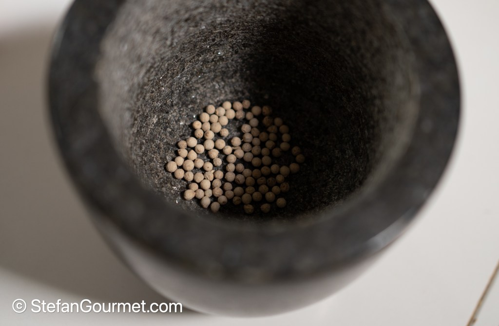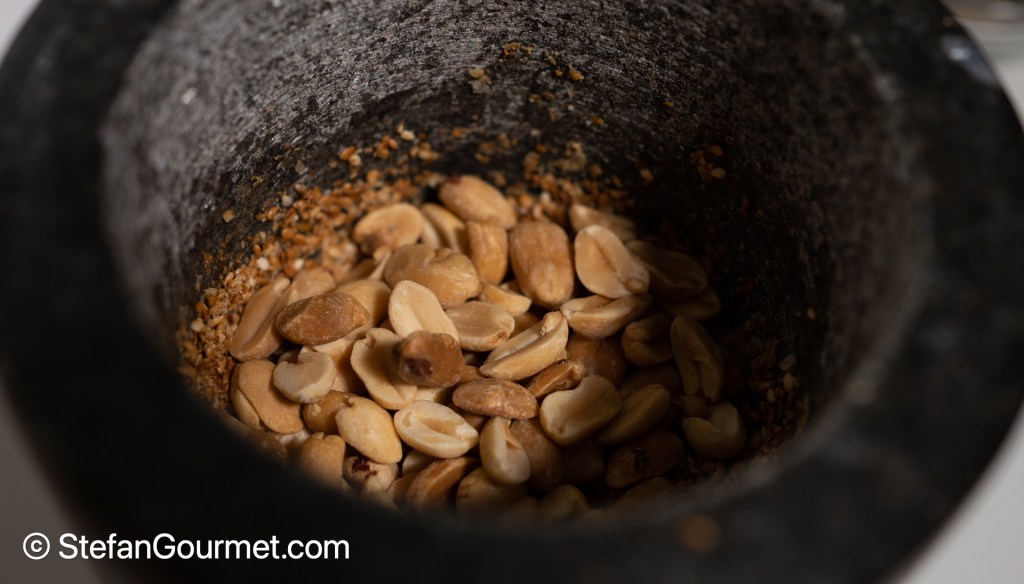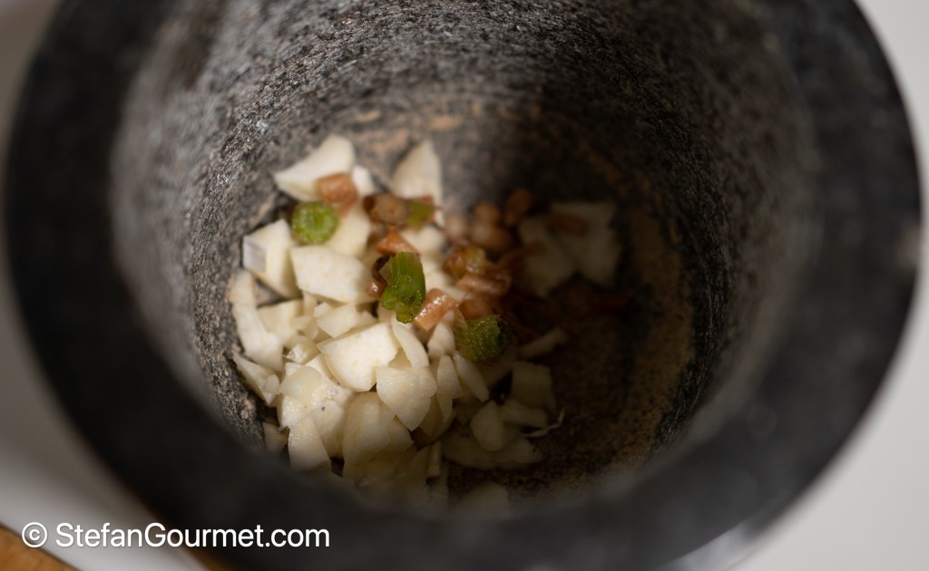 …and pound until mashed. Remove this paste from the mortar and set aside. Do not clean the mortar.