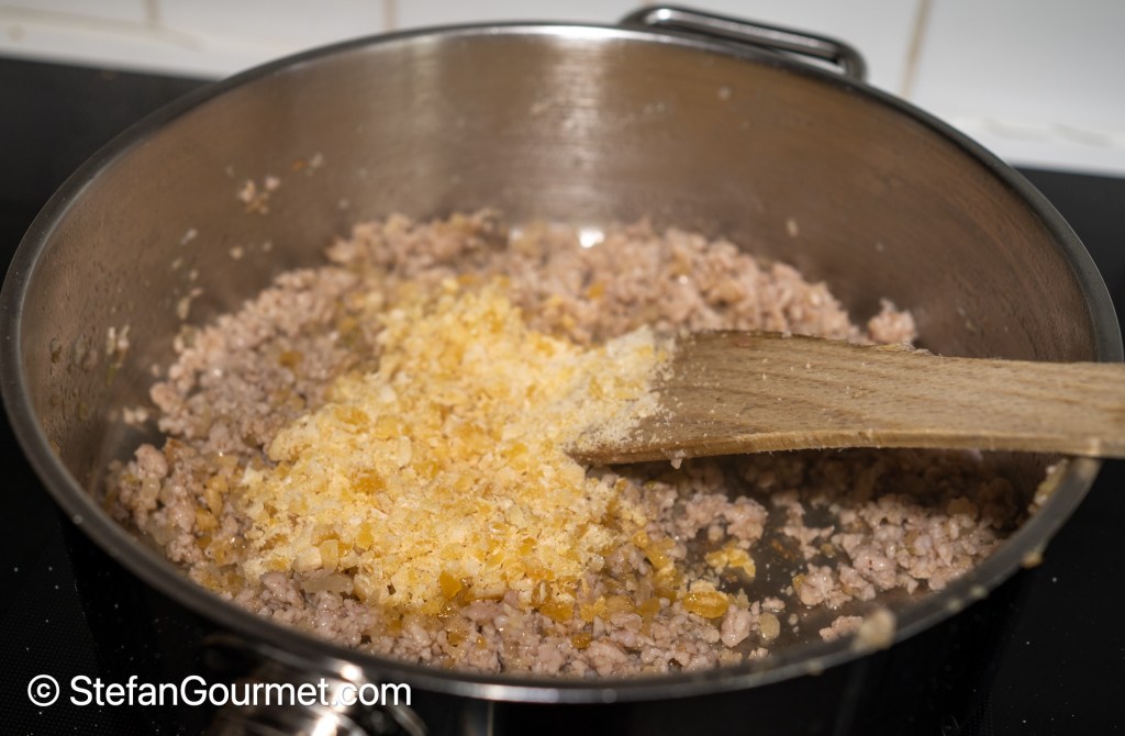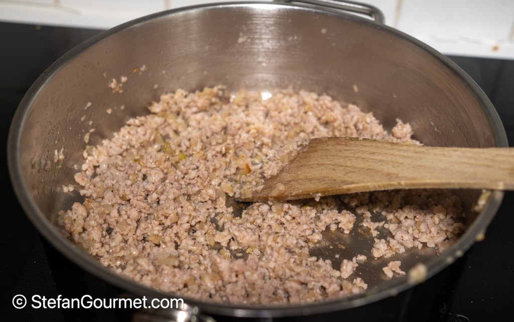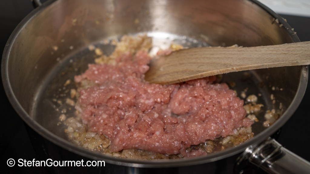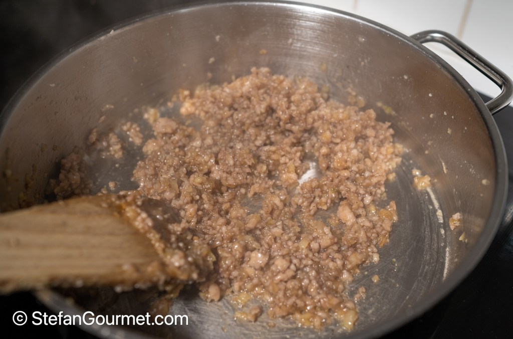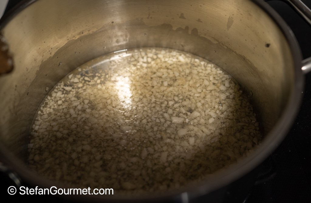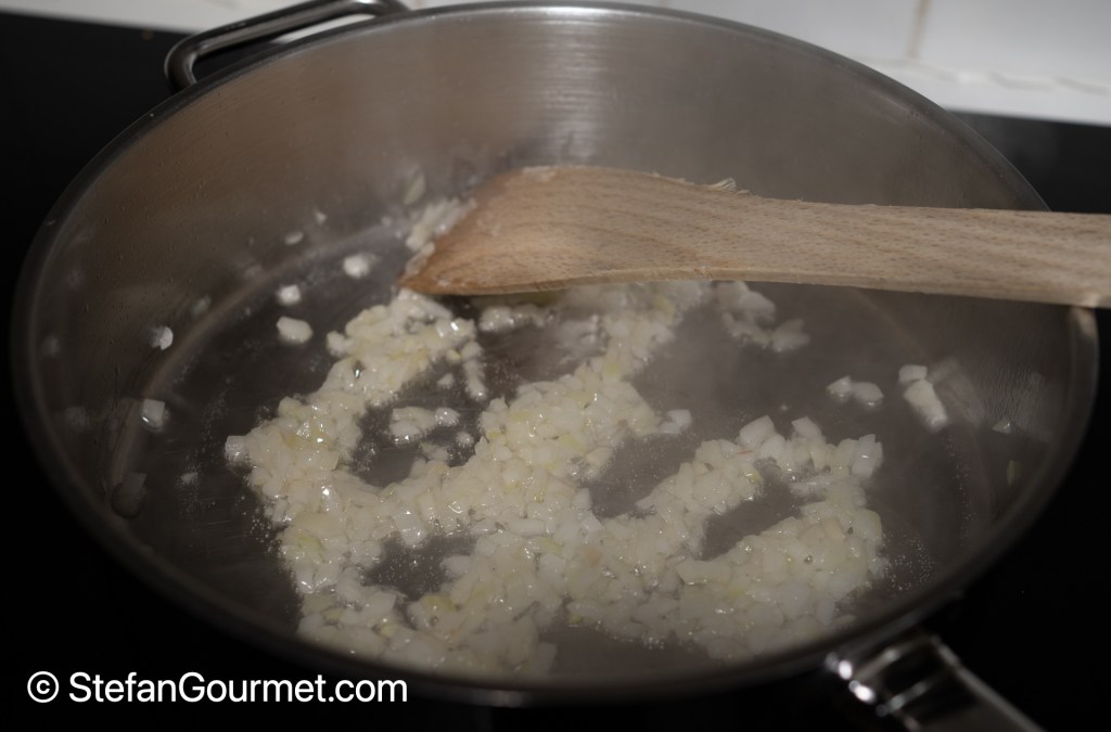 Heat 2 tablespoons of oil in a frying pan (you can also use a wok because that makes it look more Thai, but it won’t affect the taste) and add the minced onion.