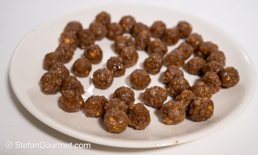 Once the filling has been chilled completely, roll it into 40 balls of 6-7 grams each, pressing on the balls with your fingers to compact them.