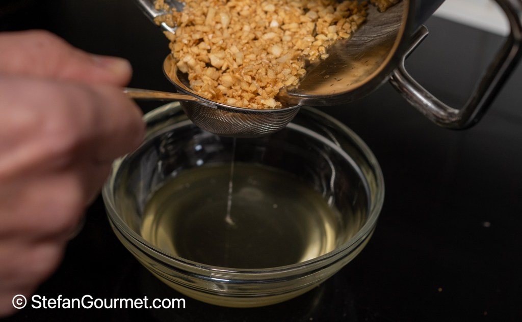 To make the garlic oil, fry a minced head of garlic in oil over low to medium heat until the garlic is crispy but not brown.