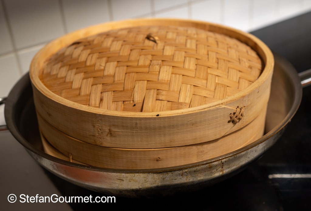 Line a steamer with perforated oven paper, and arrange the dumplings in the steamer.