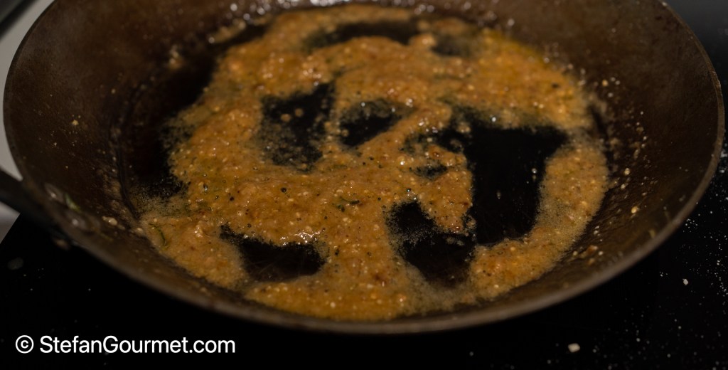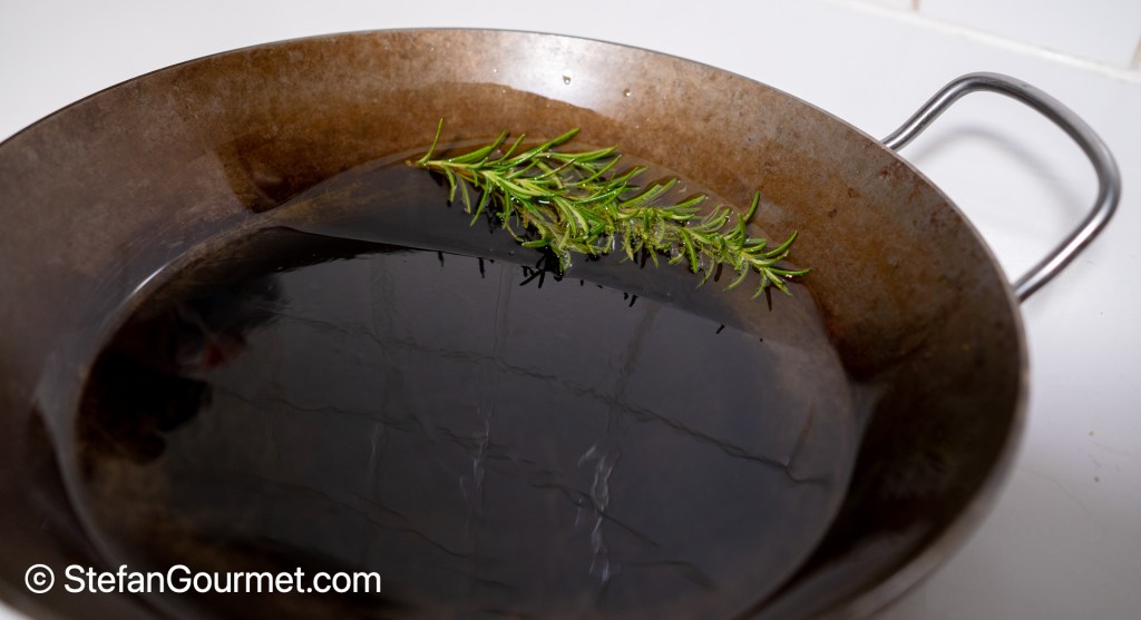 Heat the olive oil in a frying pan. Add the rosemary, tilt the pan, and allow the rosemary to fry in the oil. This is to flavor the oil with the rosemary; make sure the rosemary doesn’t burn.