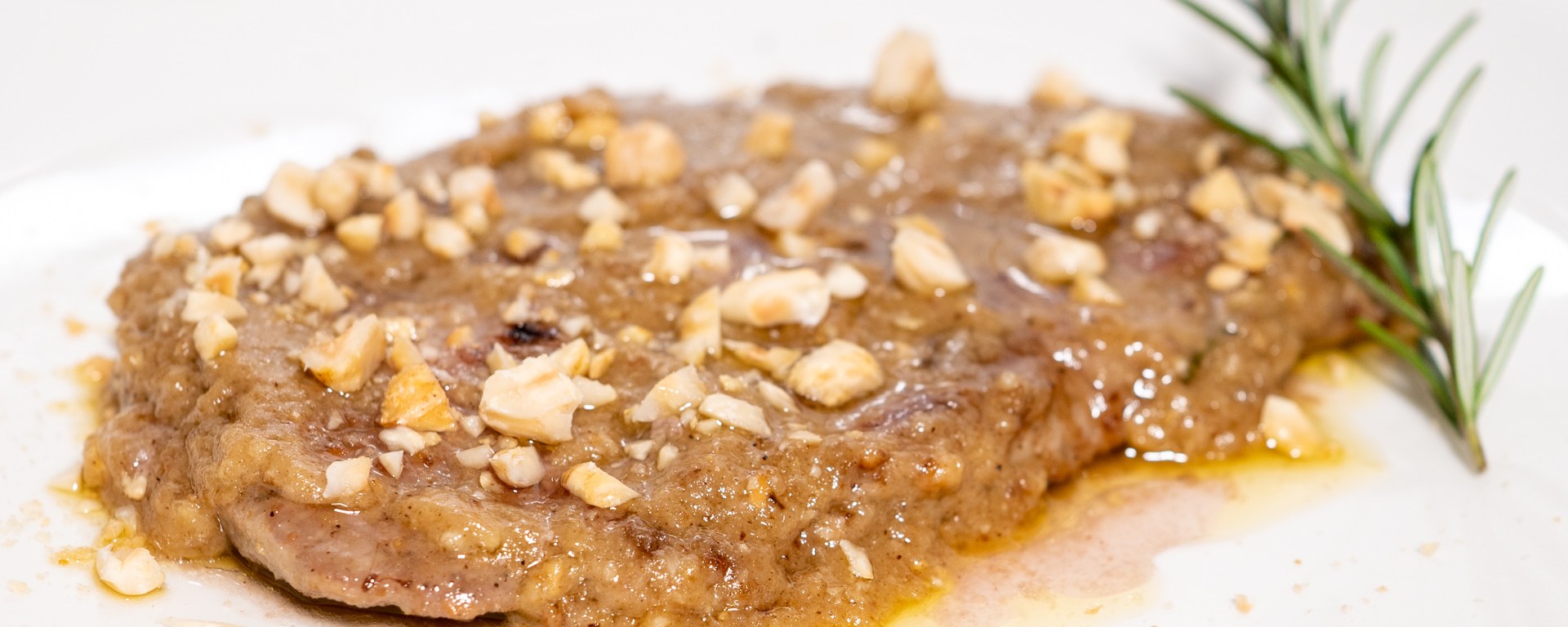 Spoon the sauce over the scaloppine, and garnish with the coarsely chopped hazelnuts. Serve at once.
