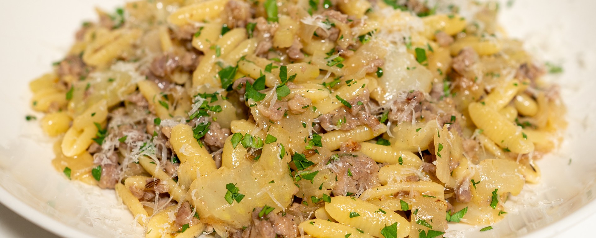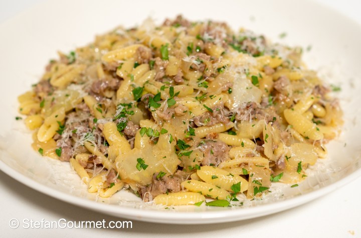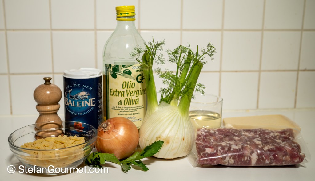 Pasta with sausage and fennel is one of our favorite pasta dishes, that I prepare on a regular basis. The flavors of the fennel, fennel seed, sausage, and pecorino cheese blend into one fantastic flavor. I like to prepare it with a pasta shape from Sardinia that is called gnochetti sardi or malloreddus because the dish hails from that island, but other short pasta like penne will also work. I’ve blogged about this before, but that post paid a lot of attention to making the pasta by hand, and so the delicious sauce was not getting enough attention. The dish is really good with store-bought short pasta as well, and then it is simple enough to make it on a week night, as it takes about half an hour altogether.