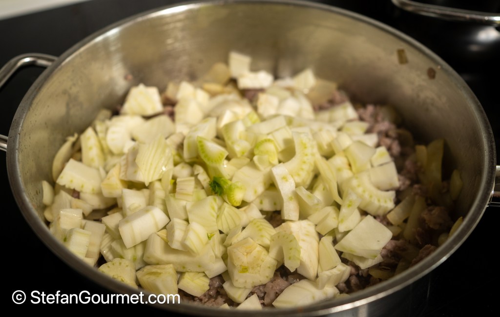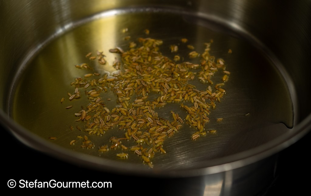 Heat 2 tablespoons of olive oil in a frying pan. Add 2 teaspoons of fennel seeds and stir them for a minute until fragrant.