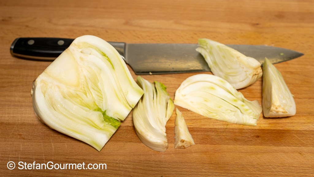 In the meantime, trim the green top off the fennel, cut the fennel into 8 wedges, and cut the core out of each wedge as shown in the photo. Then chop the fennel wedges.