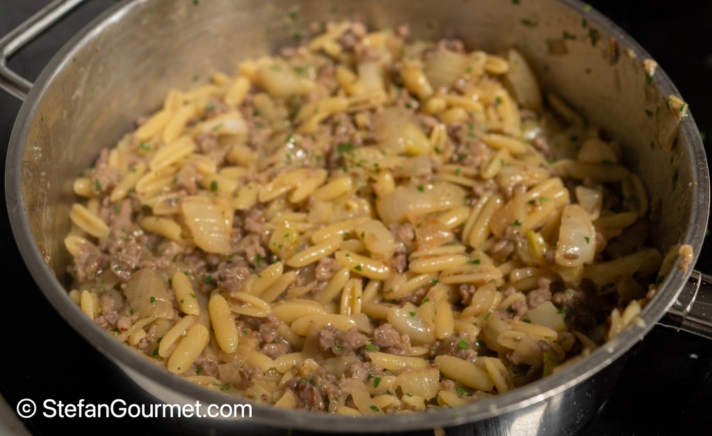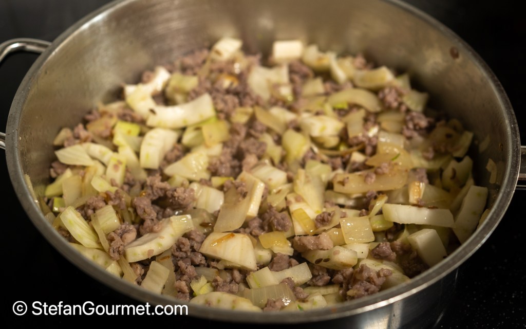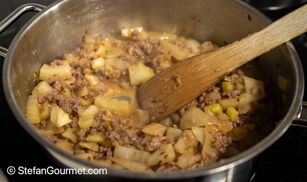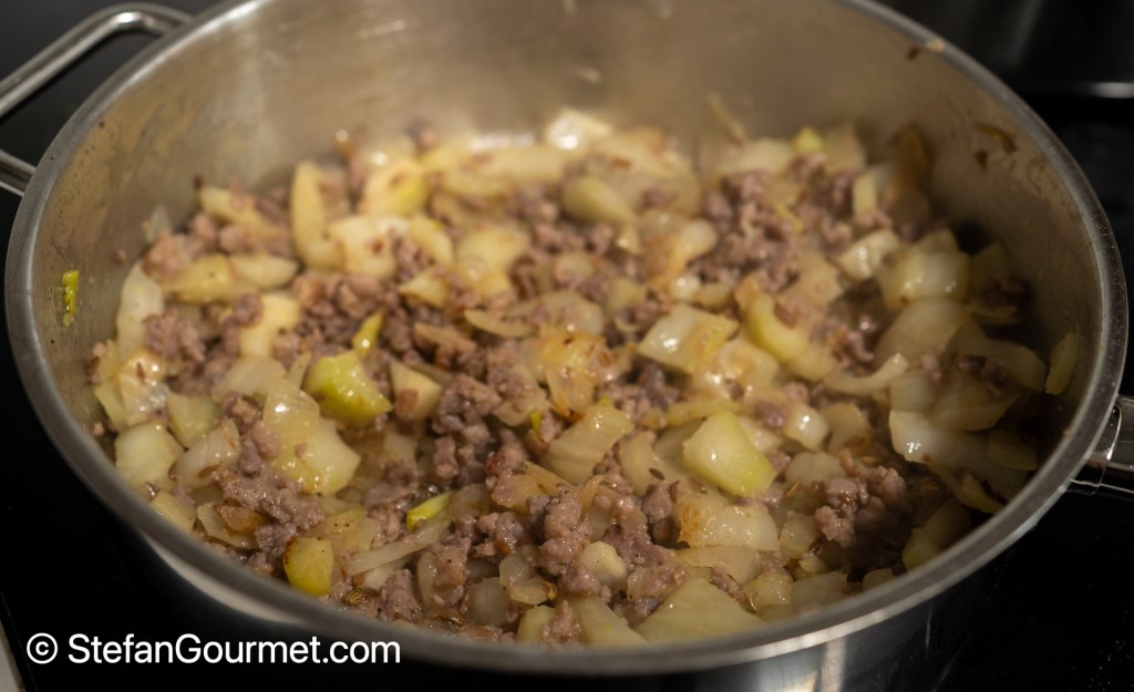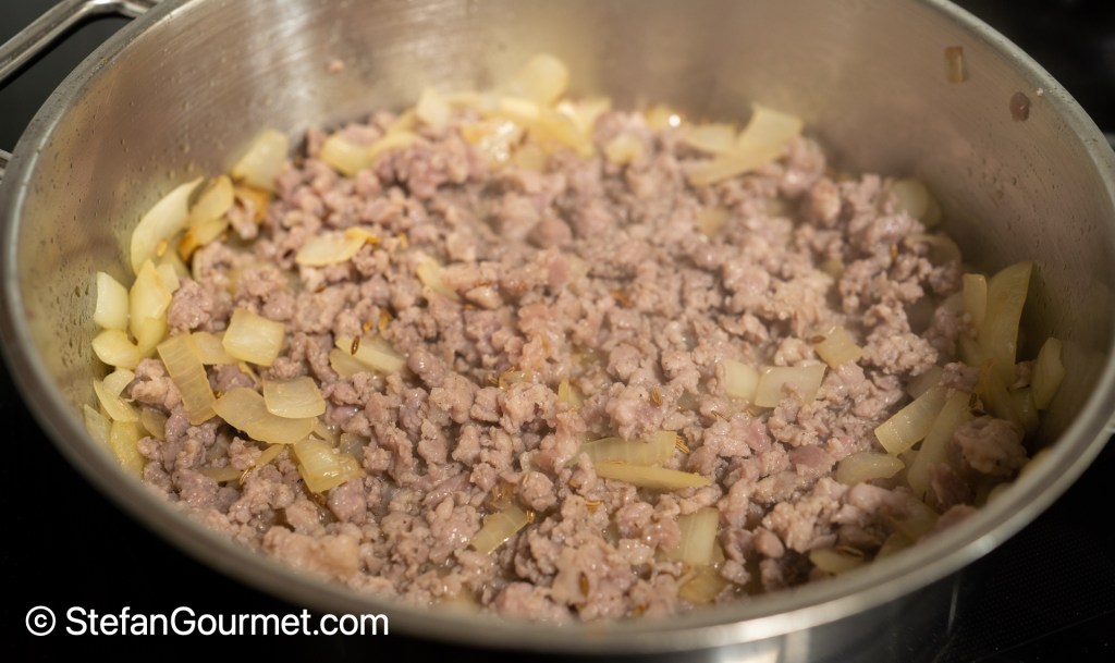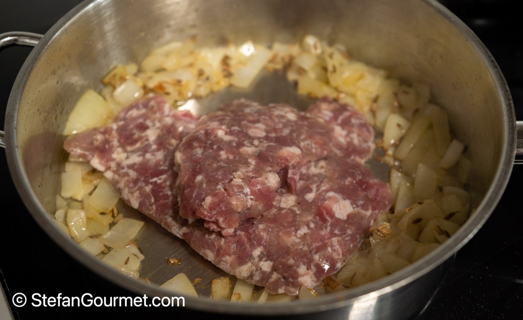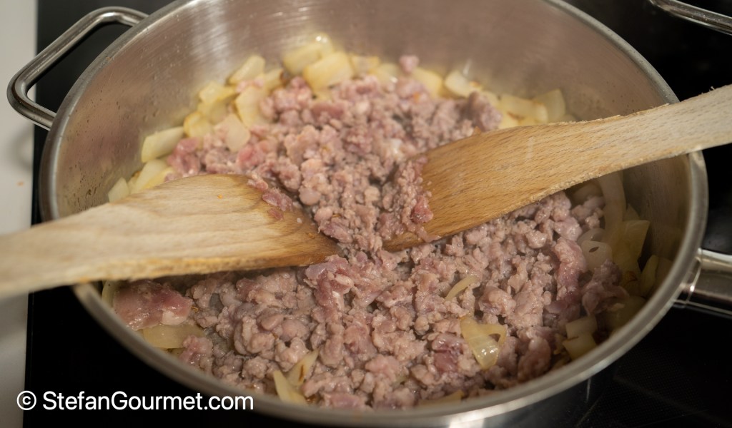 Increase the heat, and break down the sausage meat with two wooden spatulas.