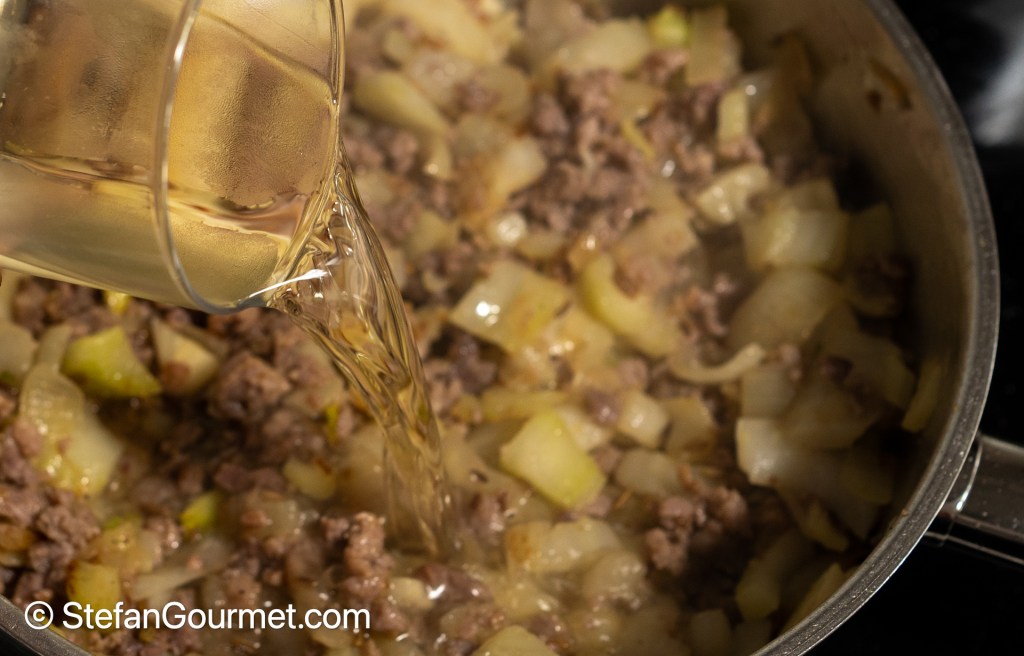 Stir with a wooden spatula, scraping the bottom of the pan to get all the flavor in the sauce. Make sure the wine has been reduced at least by half, so the alcohol will be burnt off.