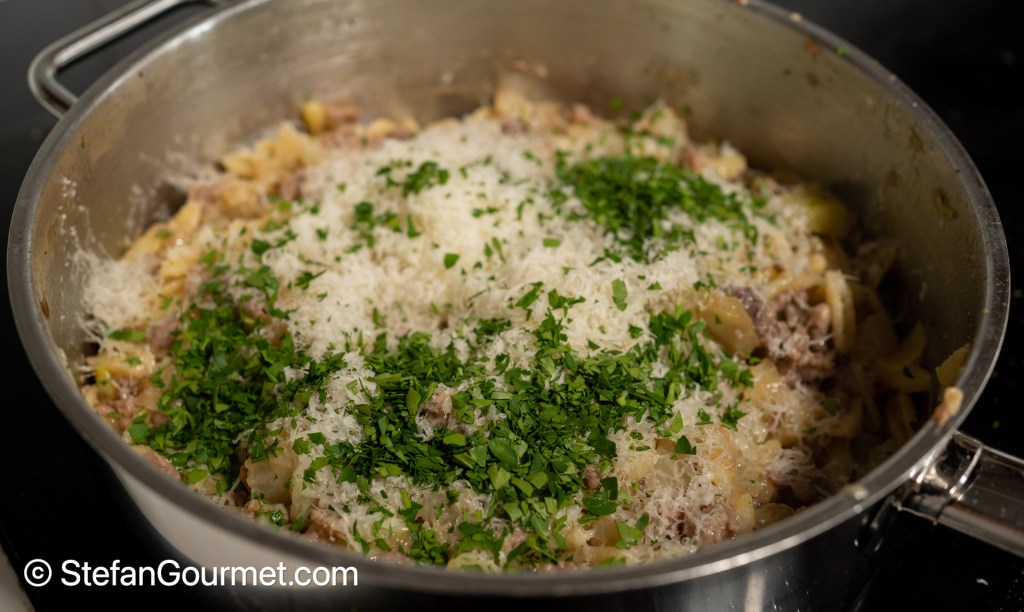 Good quality Italian pork sausage is an important ingredient. If you can’t buy it where you live, you can make it yourself. I make a large batch and then freeze it in single portions. If you can’t find pecorino sardo, then parmigiano reggiano is a good substitute.