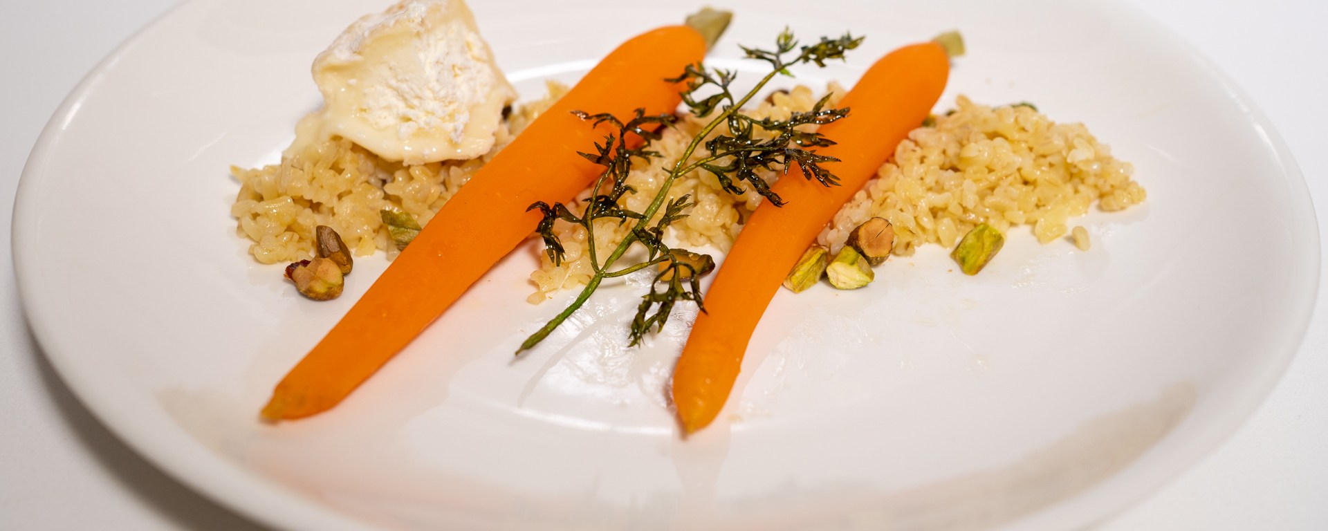 This elegant vegetarian appetizer was inspired by a more elaborate version we enjoyed at Alma** in Lisbon. The combination of flavors and textures is very nice. The sweetness of the carrots goes well with the tartness of the goat cheese and the nuttiness of the pistachios. The creamy goat cheese is a nice contrast to the different bites of the bulgur, pistachios, carrots, and crispy carrot tops. Sous vide retains the flavor and texture of the carrots better than blanching.